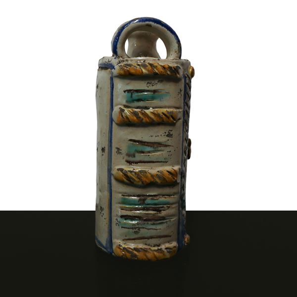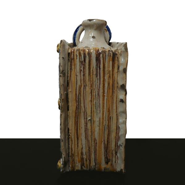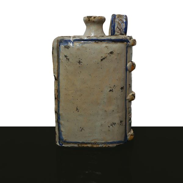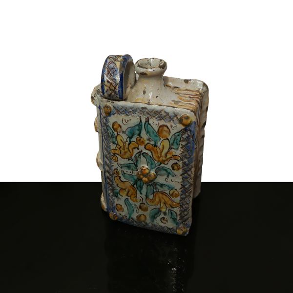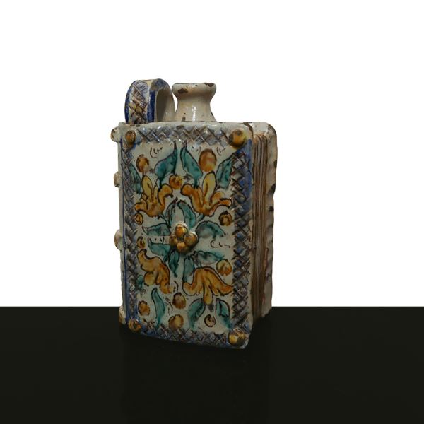 Fiasca a libro in maiolica di Caltagirone invetriata e dipinta policroma con decori floreali e dettagli a rilievo, Inizi XX secolo