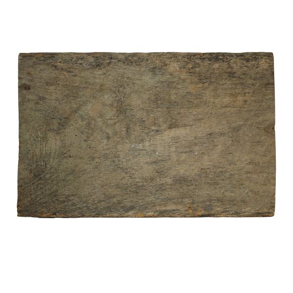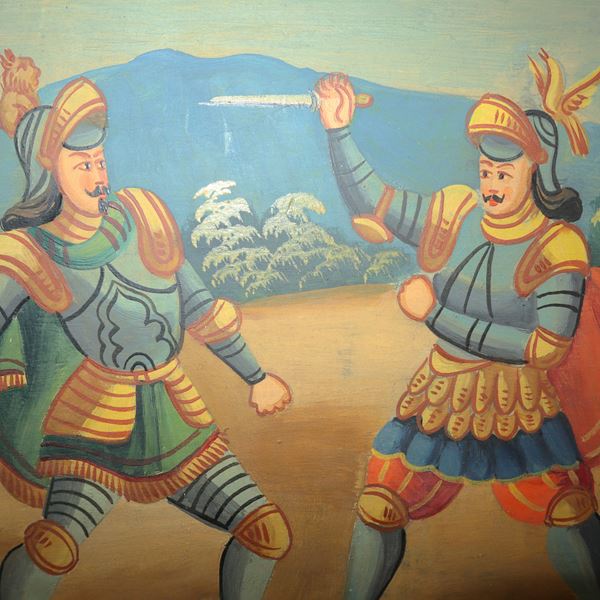 Frammento di sponda di carretto in legno policromo dipinto con scena di combattimento di paladini, XIX/XX secolo