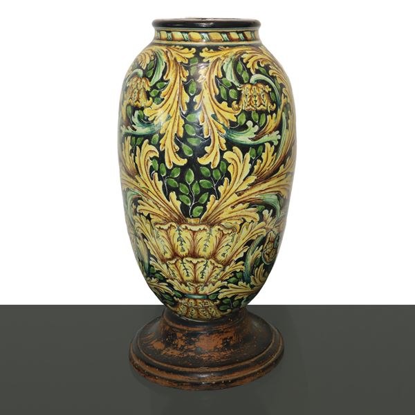 Grande vaso in maiolica di Caltagirone con raffigurazione di Donna con fiaccola, Bottega Di Bartolo, fine XIX secolo