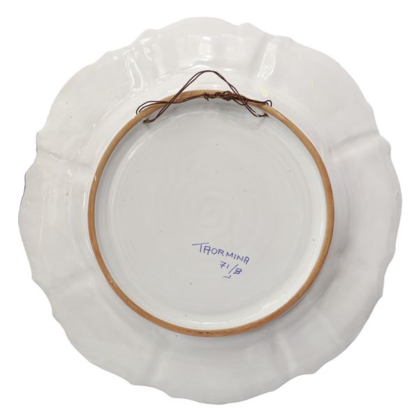 Piatto da muro smerlato, base bianca, disegni floreali e uccelli nei toni del blu, Taormina