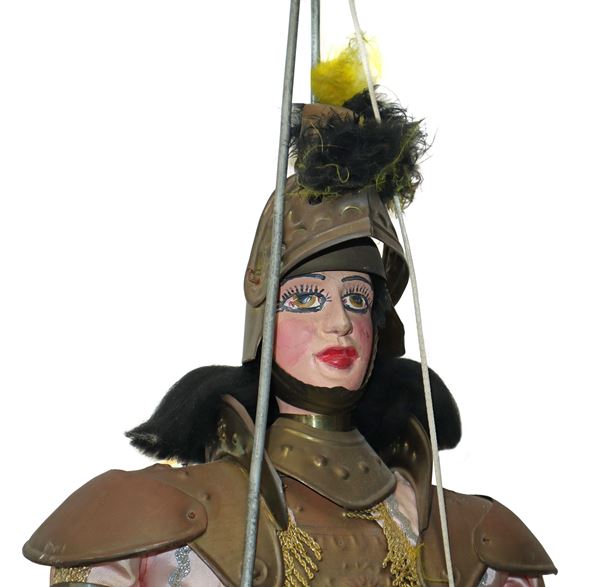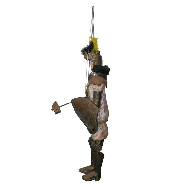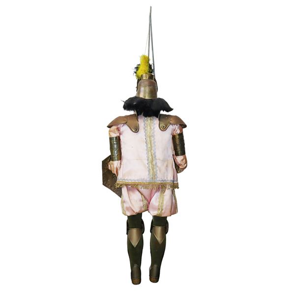Pupo siciliano con armatura in metallo e vestiti in tessuto rosa