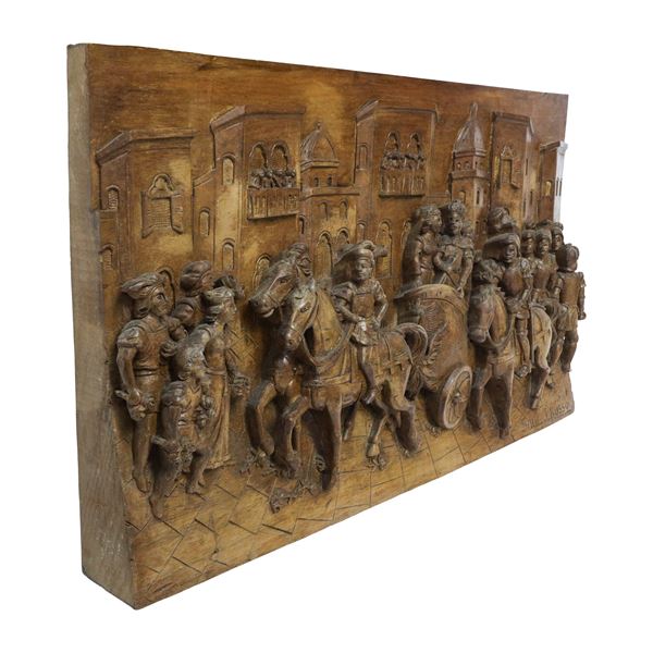 Pannello ligneo scolpito e intagliato a rilievo e bassorilievo su legno di noce , Scena della Chanson de Roland dei paladini di Francia , Prima metà XX secolo