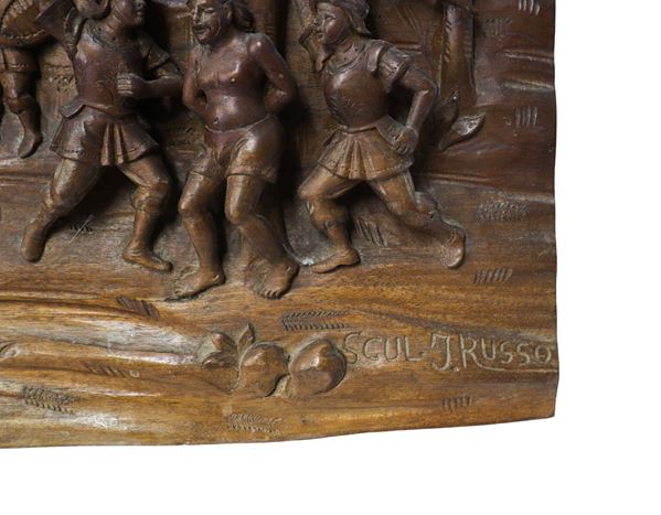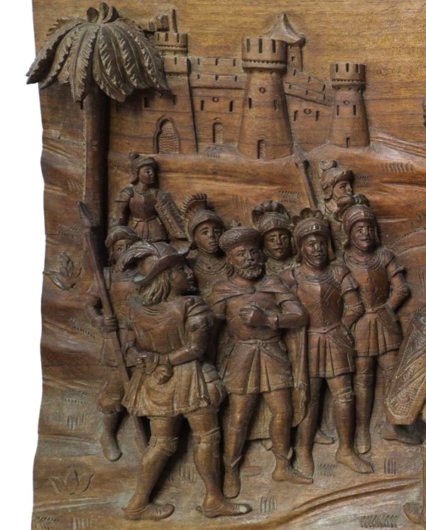 Pannello ligneo scolpito e intagliato a rilievo e bassorilievo su legno di noce , Scena della Chanson de Roland dei paladini di Francia , Prima metà XX secolo