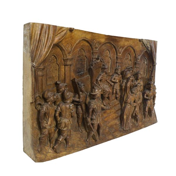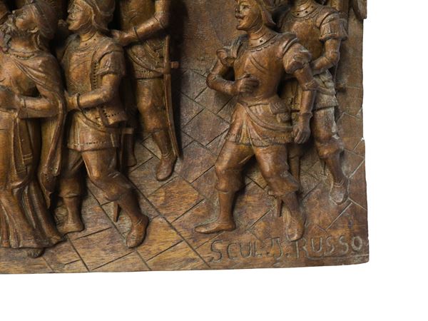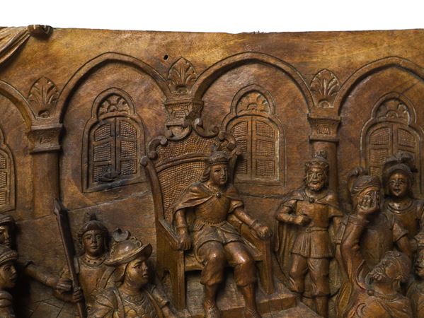 Pannello ligneo scolpito e intagliato a rilievo e bassorilievo su legno di noce , Scena della Chanson de Roland dei paladini di Francia , Prima metà XX secolo