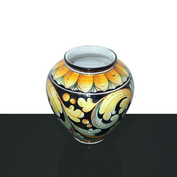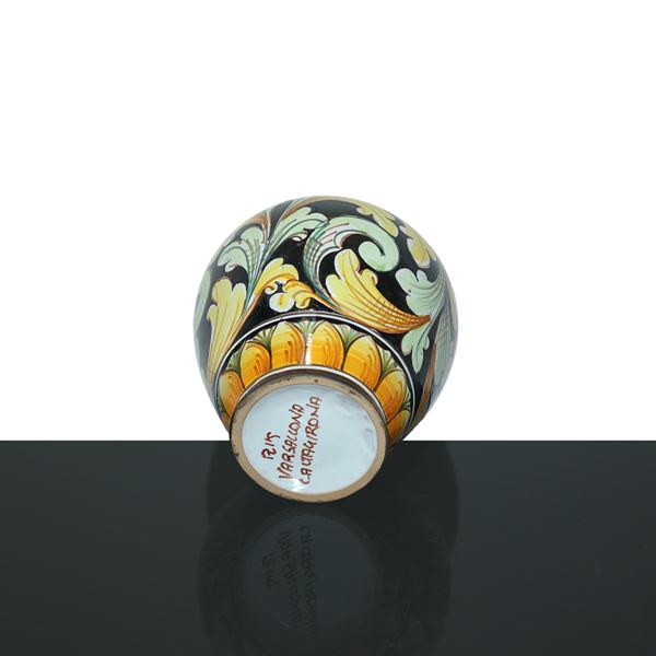 Vaso in maiolica di Caltagirone policromo e decorato a foglie su fondo nero, XX secolo