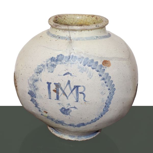 Vaso di Caltagirone in pasta bianca invetriato nei toni dell'azzurro con iniziali sul fronte IMR, 1760