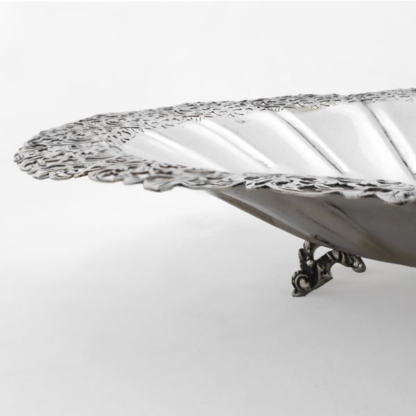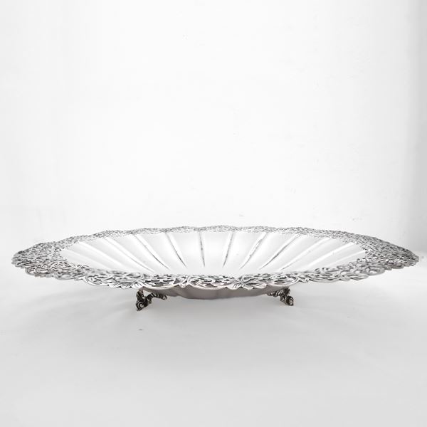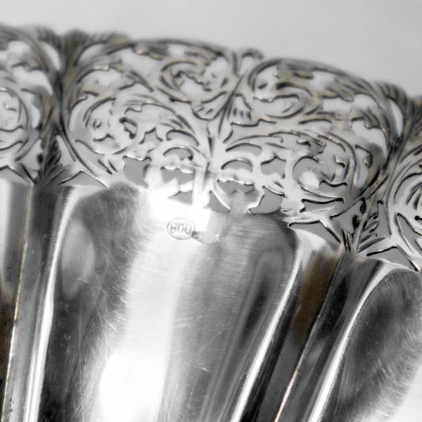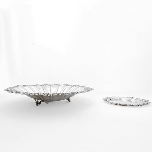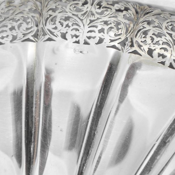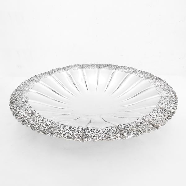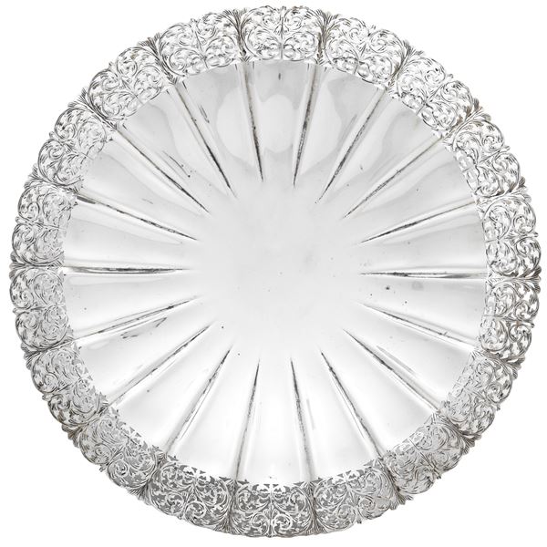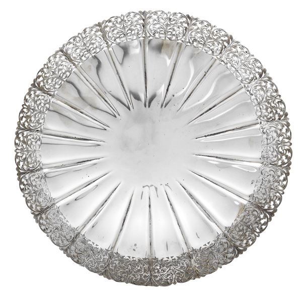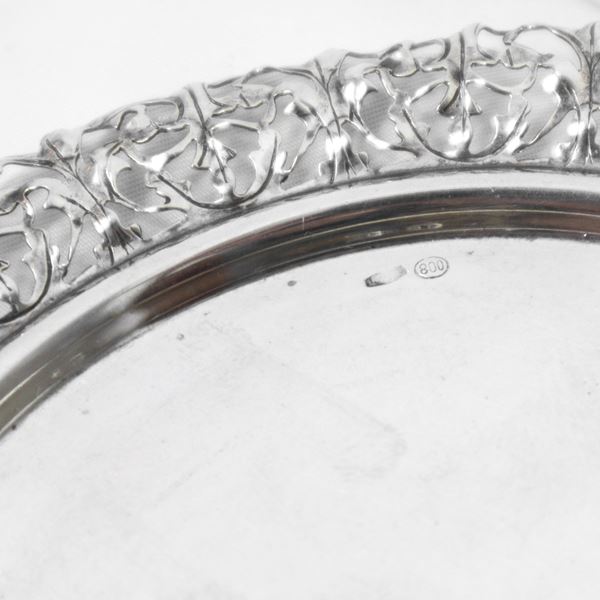 Portabottiglie e alzata rotondi in argento 800 con bordo filigranato