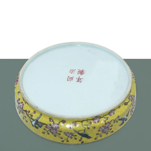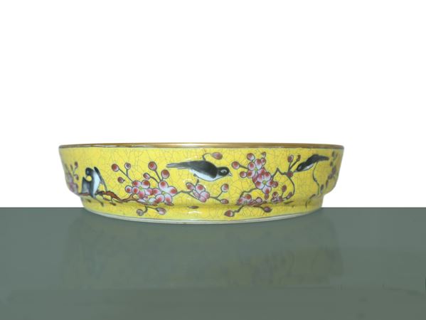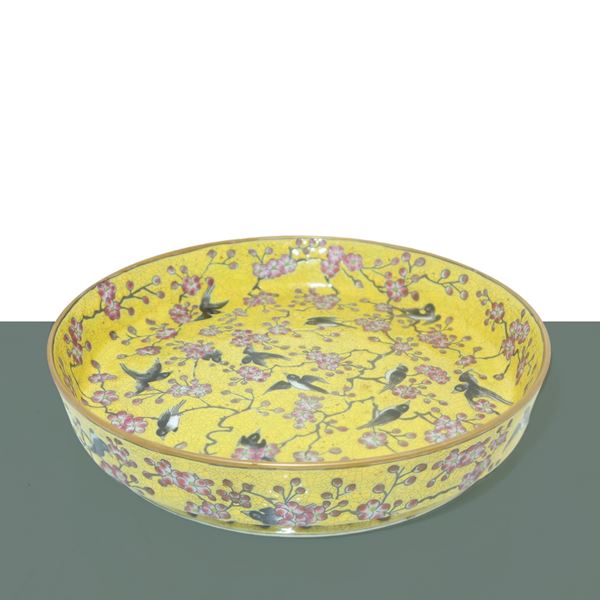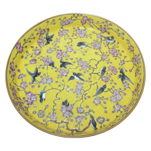 Ciotola gialla con decori di rondini in smalti cloisonnet, dinastia Qinq periodo Tongzhi nian zhi