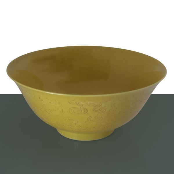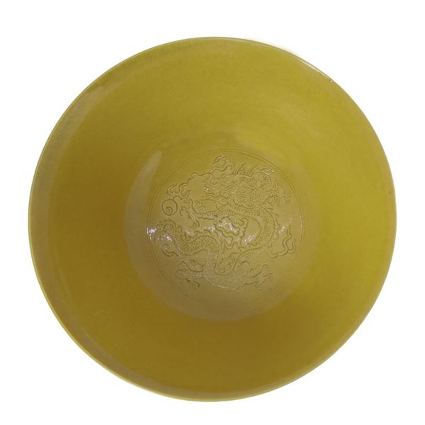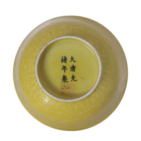 Ciotola gialla con decoro inciso raffigurante dragoni, Guangxu