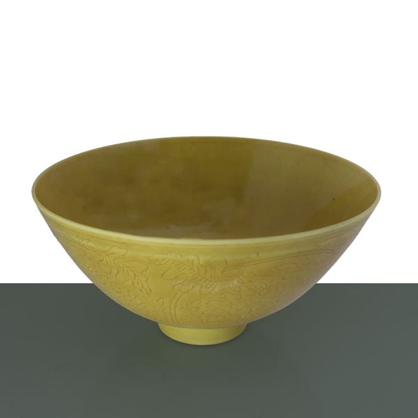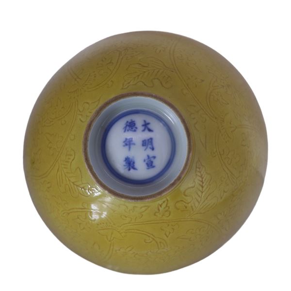 Ciotola gialla invetriata con incisioni floreali, dinastia Ming