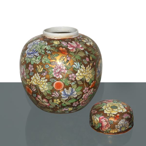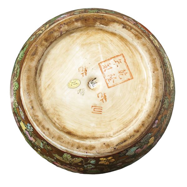 Coppia di poutiche cinesi con decori floreali in smalti policromi a rilievo
