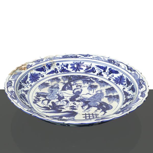 Grande piatto cinese in ceramica bianca con scene di personaggi storici dipinte in blu, dinastia Yuan