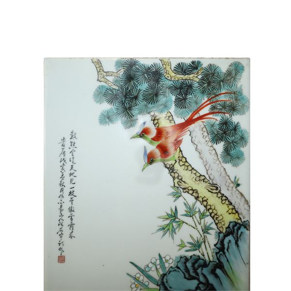Mattonella cinese in ceramica con raffigurazione di albero con uccelli e iscrizioni, XX secolo