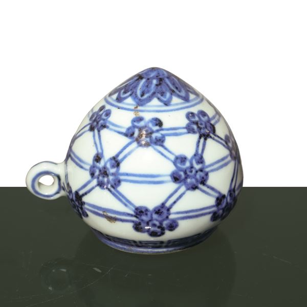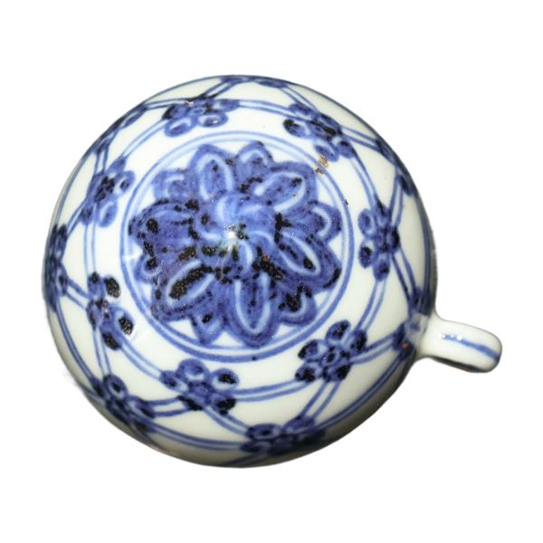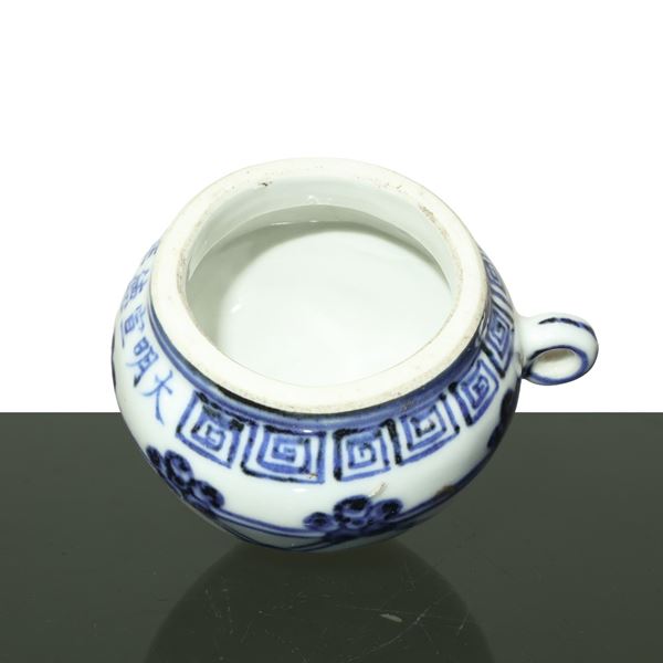 Piccolo barattolo cinese per cibo per uccelli in porcellana decorata blu e bianca con iscrizioni, dinastia Ming