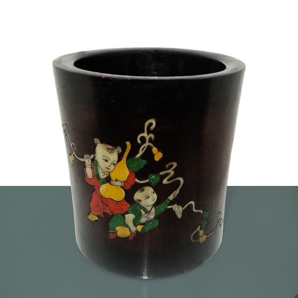 Portapennelli in legno con decoro intagliato con inserti di pietre dure raffigurante bambini che giocano ed un decoro floreale
