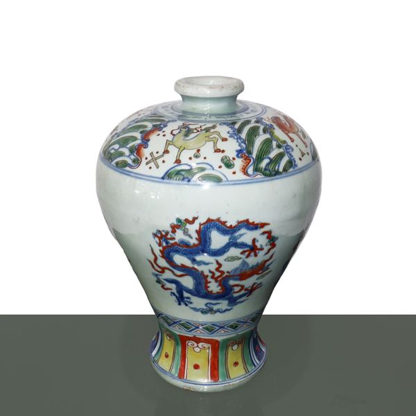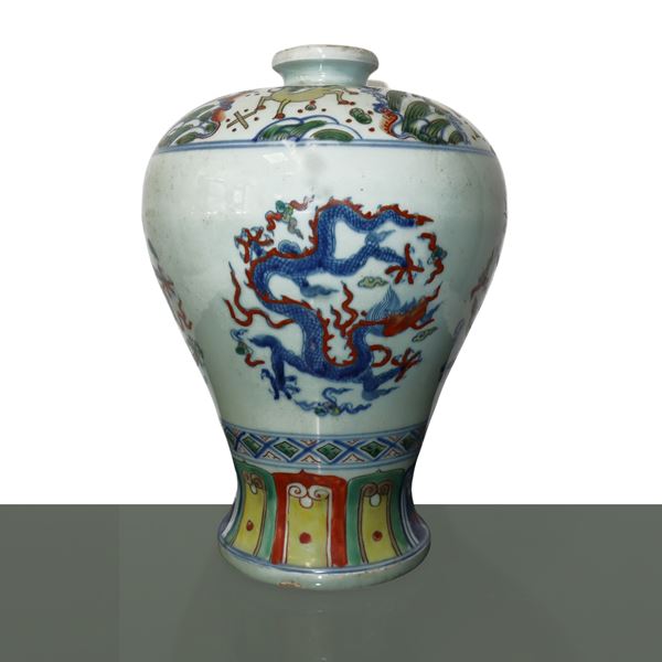 Vaso cinese Doucai Meiping dipinta con motivi tradizionali di dragoni, dinastia Ming