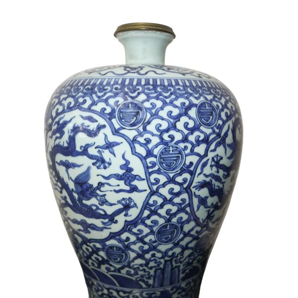 Vaso Mei ping riadattato come lampada da tavolo nel XIX secolo bianca con decori sui toni del blu, dinastia Ming periodo Wanli