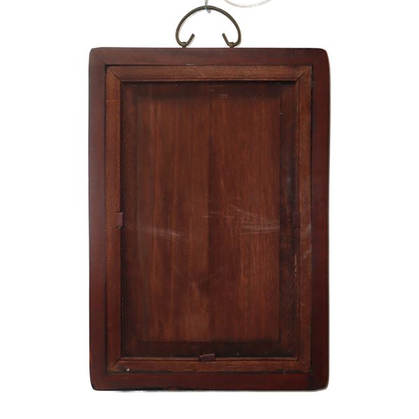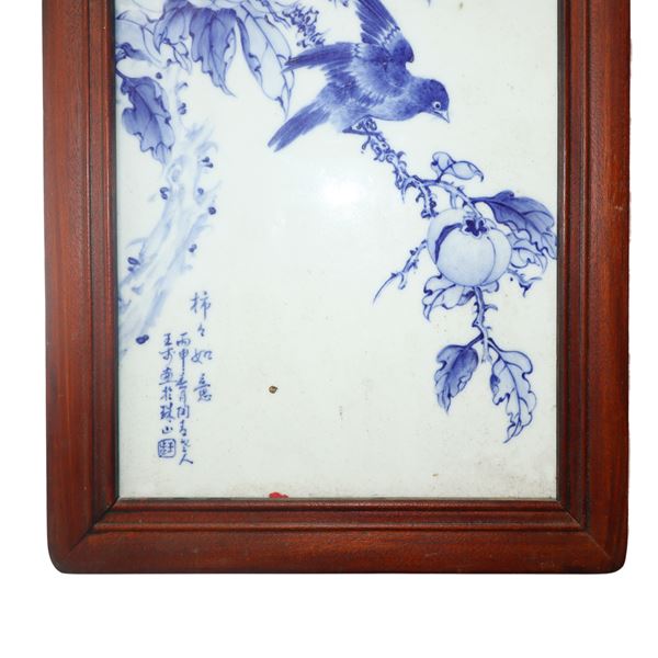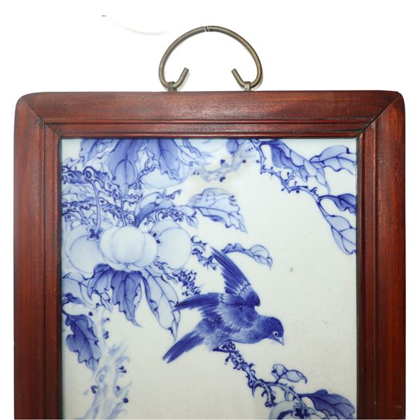 Mattonella cinese in ceramica bianca dipinta con uccelli e frutti e iscrizione nei toni del blu