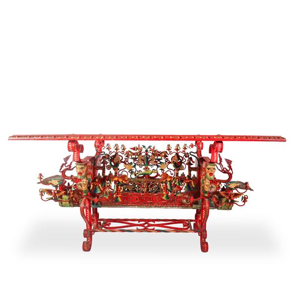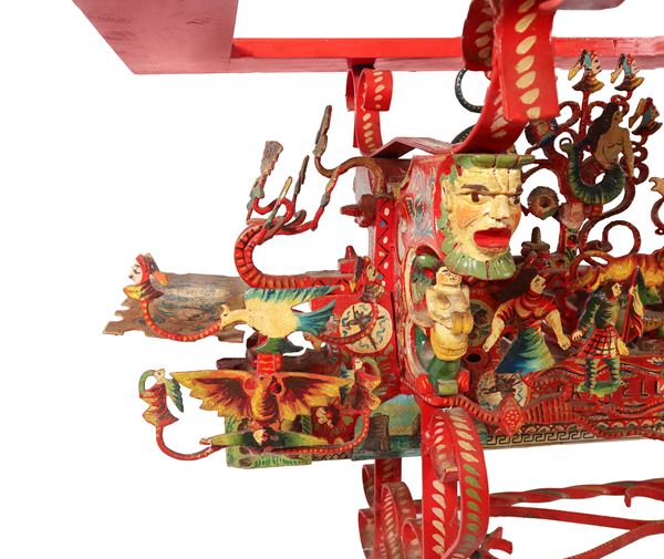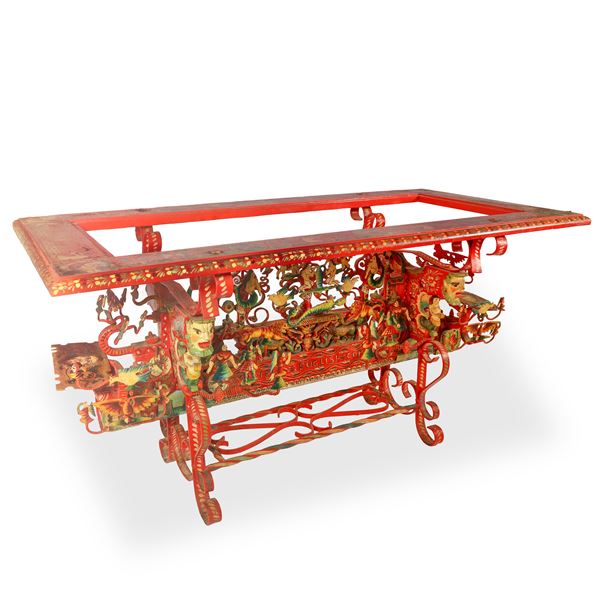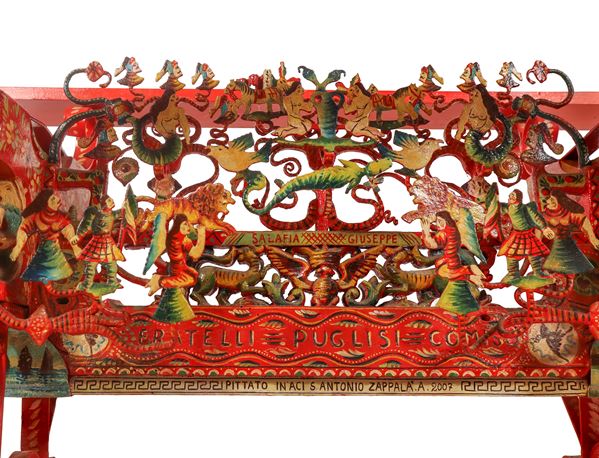 Tavolino in legno dipinto policromo con scene siciliane e paladini