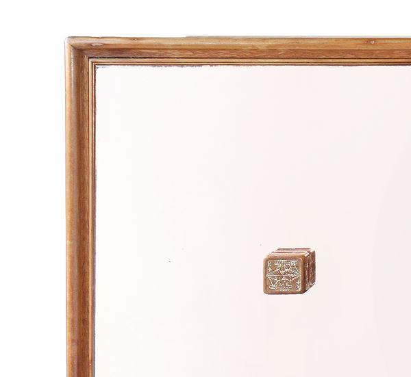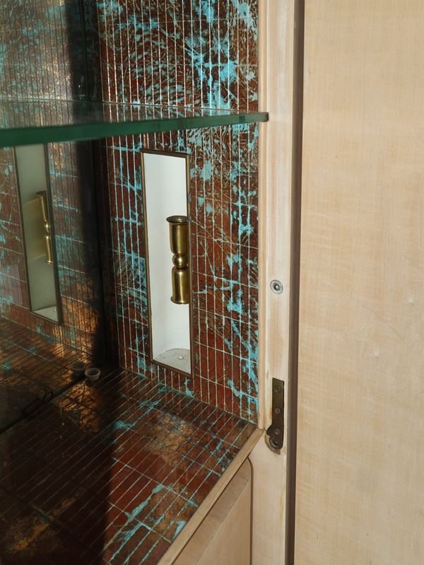 Pezzo unico realizzato su commissione. Ispirato al modello "5142" e realizzato interamente a mano, questo mobile si appoggia elegantemente su una base a onda Decò intagliata in legno, mostrando una raffinatezza senza tempo. Il dettaglio dei quattro semi delle carte da gioco su ogni manico aggiunge un tocco di personalità. Le superfici in vetro e specchio, l'interno con strisce verticali di mosaico dorato e verde, la struttura in mogano lucido. Illuminazione interna (da revisionare). Segni del tempo