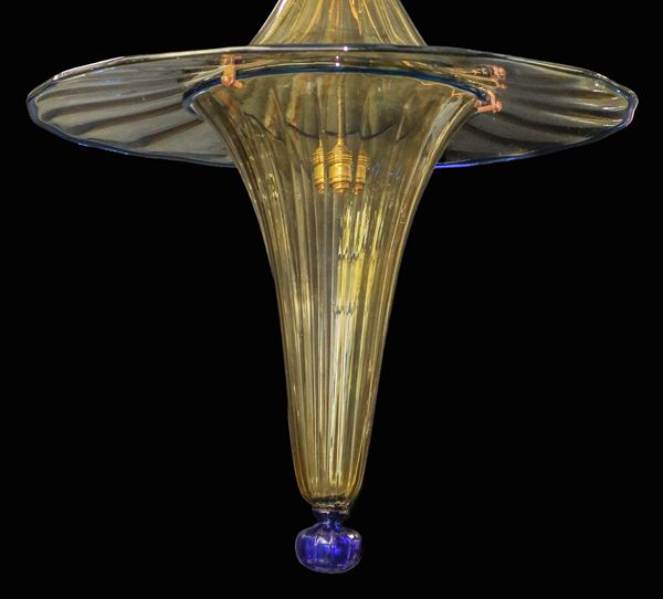 Lampadario in vetro di Murano color pagliesco con perfilo blu