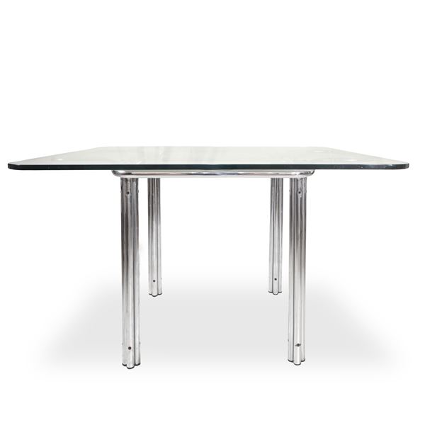 Tavolo modello Topos con struttura in metallo cromato argentato che partendo da terra si apre come un fiore per sostenere un piano quadrato in cristallo
