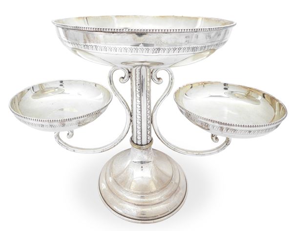 Alzatina con tre piatti in metallo argentato