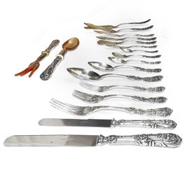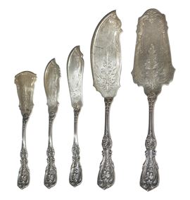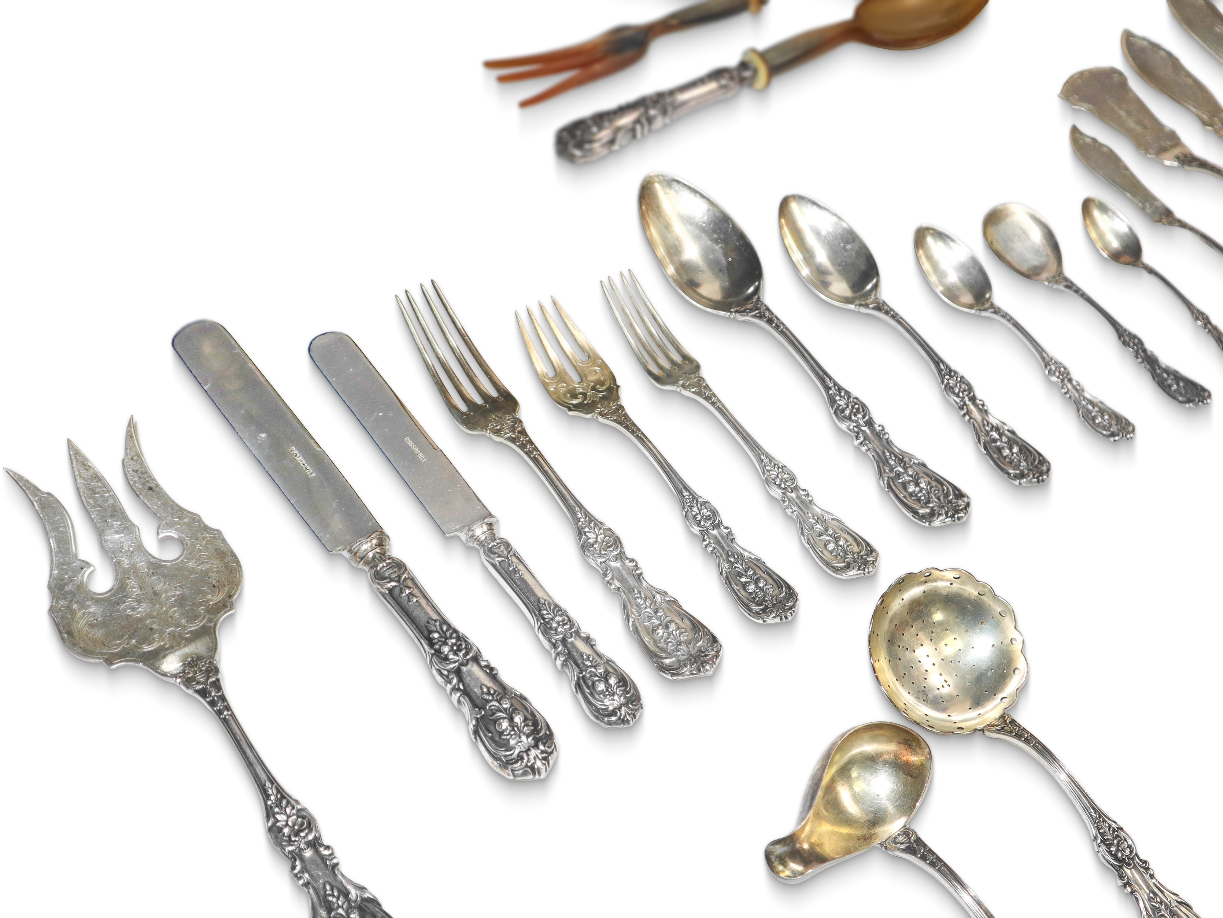 Servizio composto da: 12 forchette (766 gr), 12 forchettine dolce (gr 384), 12 cucchiaini (224 gr.), 24 forchette grandi (2294 gr), 12 cucchiai (1168 gr.), 12 forchette frutta (738 gr.), 12 cucchiaini dolce (714 gr.), 10 cucchiaini da te (332 gr.), 17 posate da portata (1986 gr), 12 coltelli pesce (828 gr.), 12 cucchiaini gelato (366 gr.), 12 coltelli piccoli (362 gr.) 2 posate da insalata (168 gr), coltelli (3584 gr.)