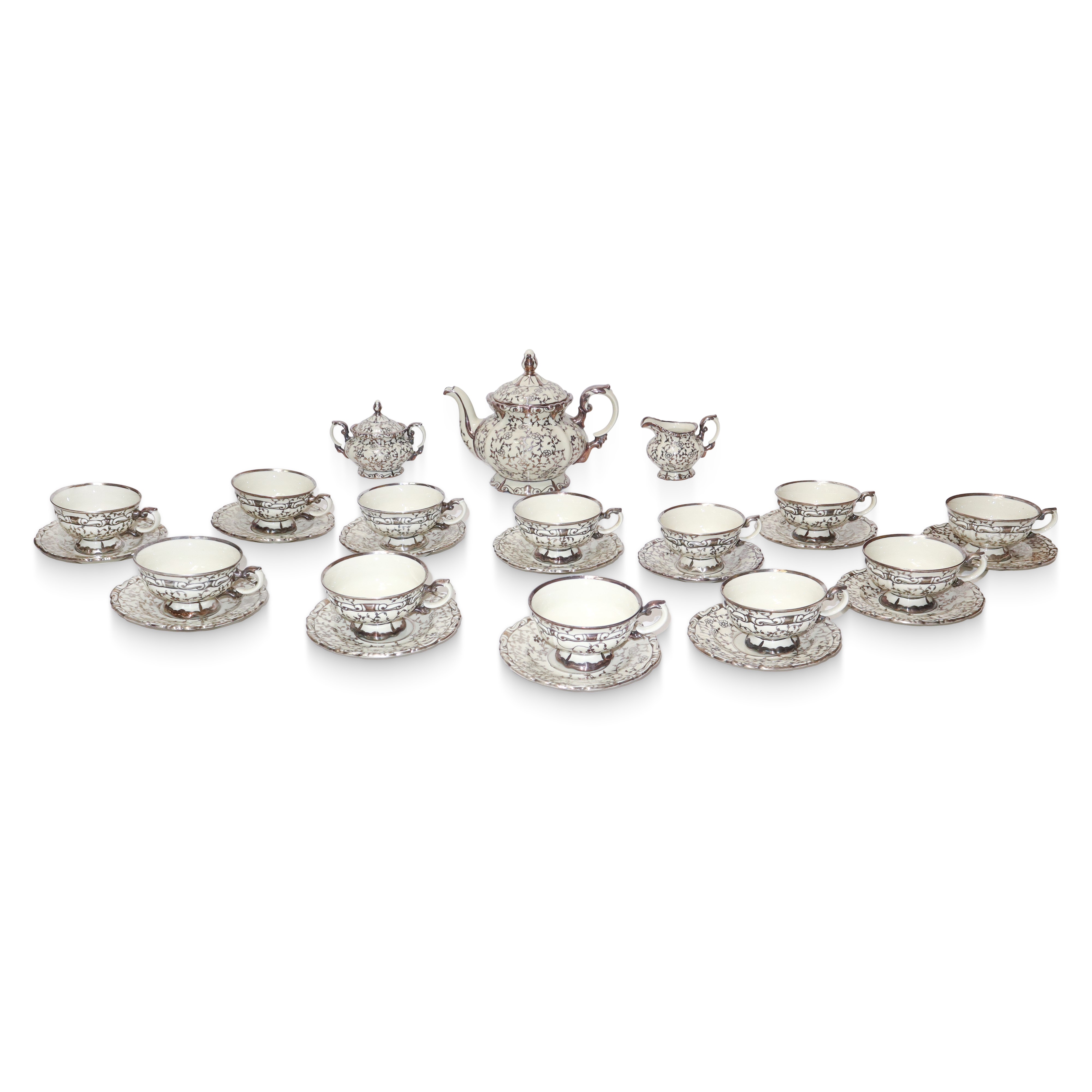 Servizio composto da: 12 tazze con piattino, teiera, lattiera, zuccheriera