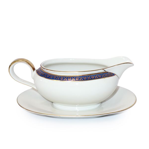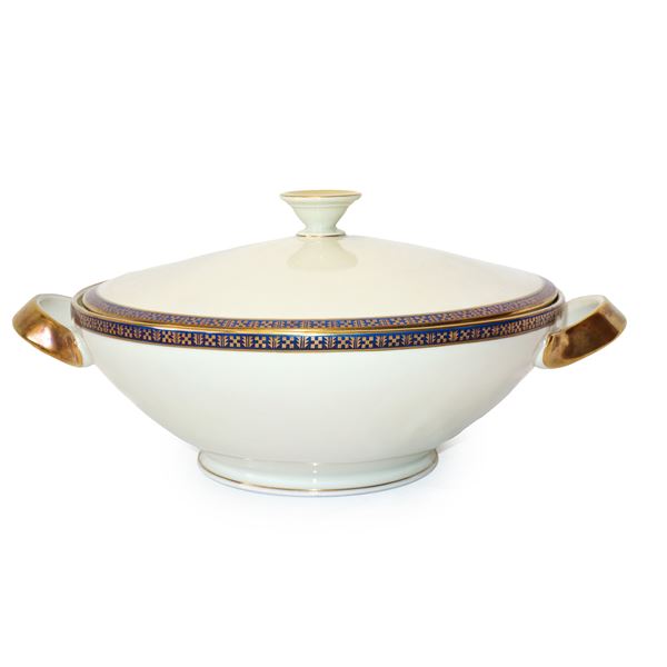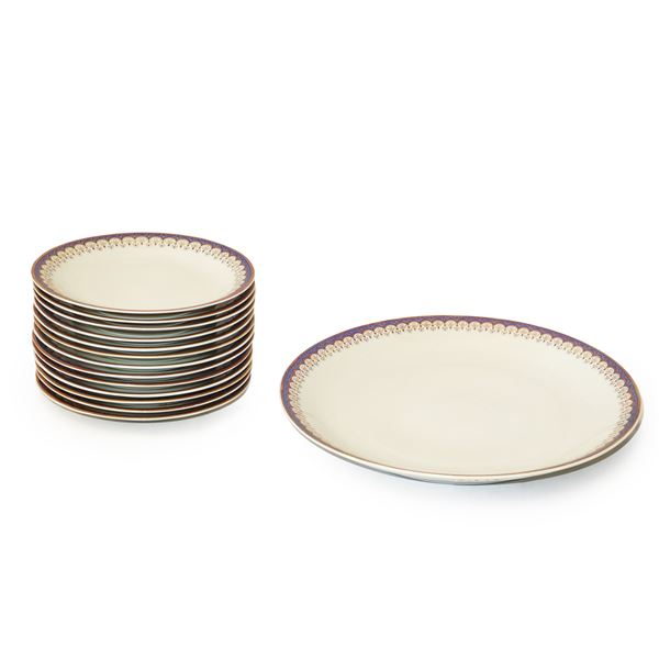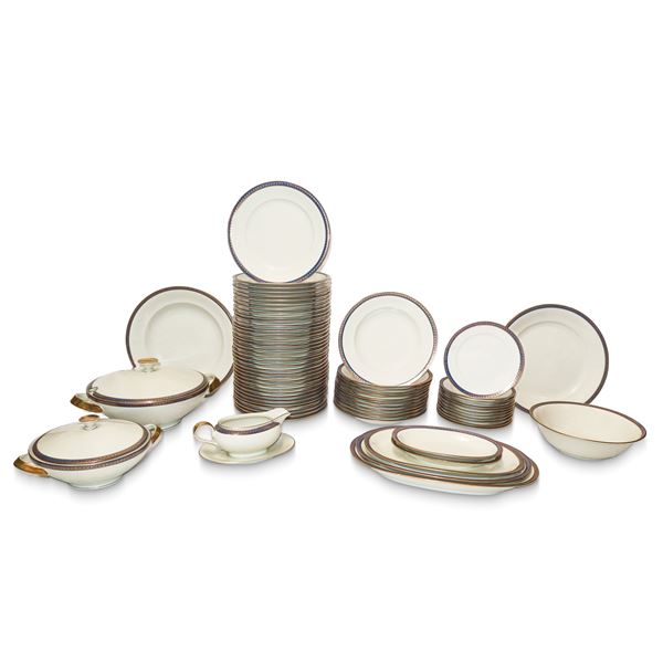 Servizio composto da: 36 piatti piani, 12 piatti fondi, 12 da frutta, 5 piatti da portata ovali, 2 piatti da portata rotondi, 2 zuppiere, 1 salsiera, 1 insalatiera