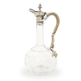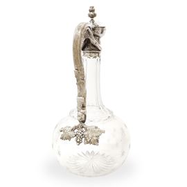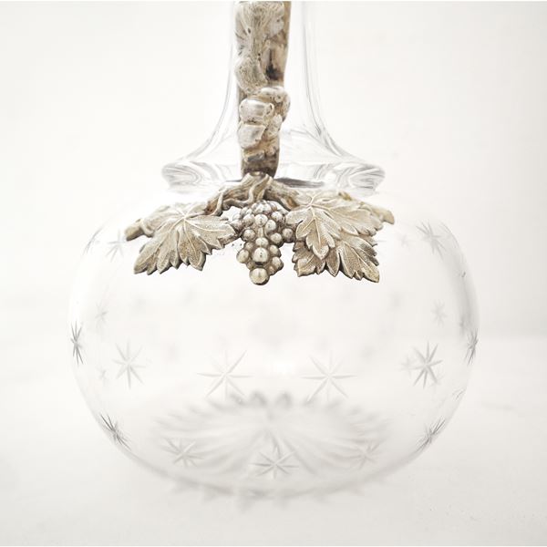 Caraffa in vetro molato con manico in metallo decorato con tralci d'uva