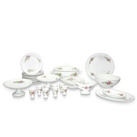 Assortimento di un servizio composto da 8 piatti fondi, 18 piatti piani, 1 zuppiera, 2 alzatine, 1 insalatiera, 3 piatti da portata (1 ovale grande 1 ovale piccolo 1 rotondo) 1 salsiera con mestolo, 8 portauovo.