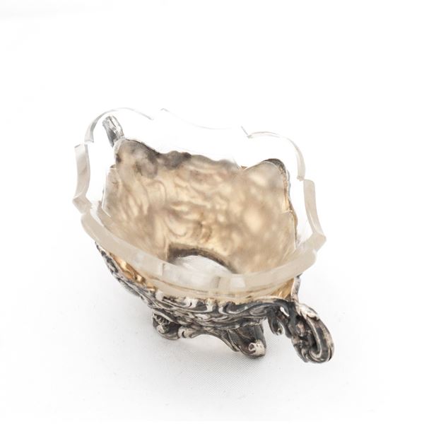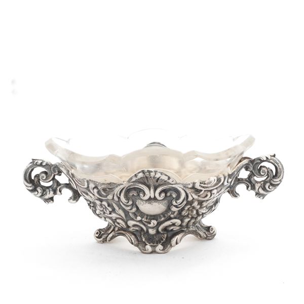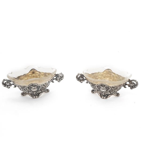 Ciotoline sale e pepe in vetro con base in sheffield biansata decorata a sbalzo