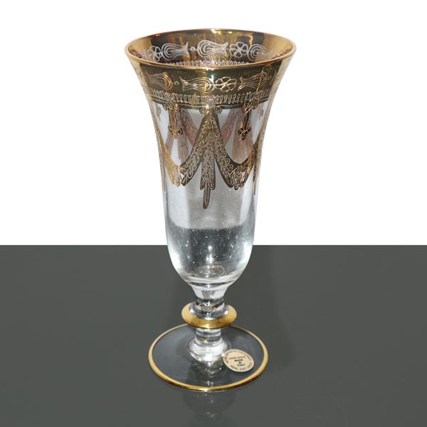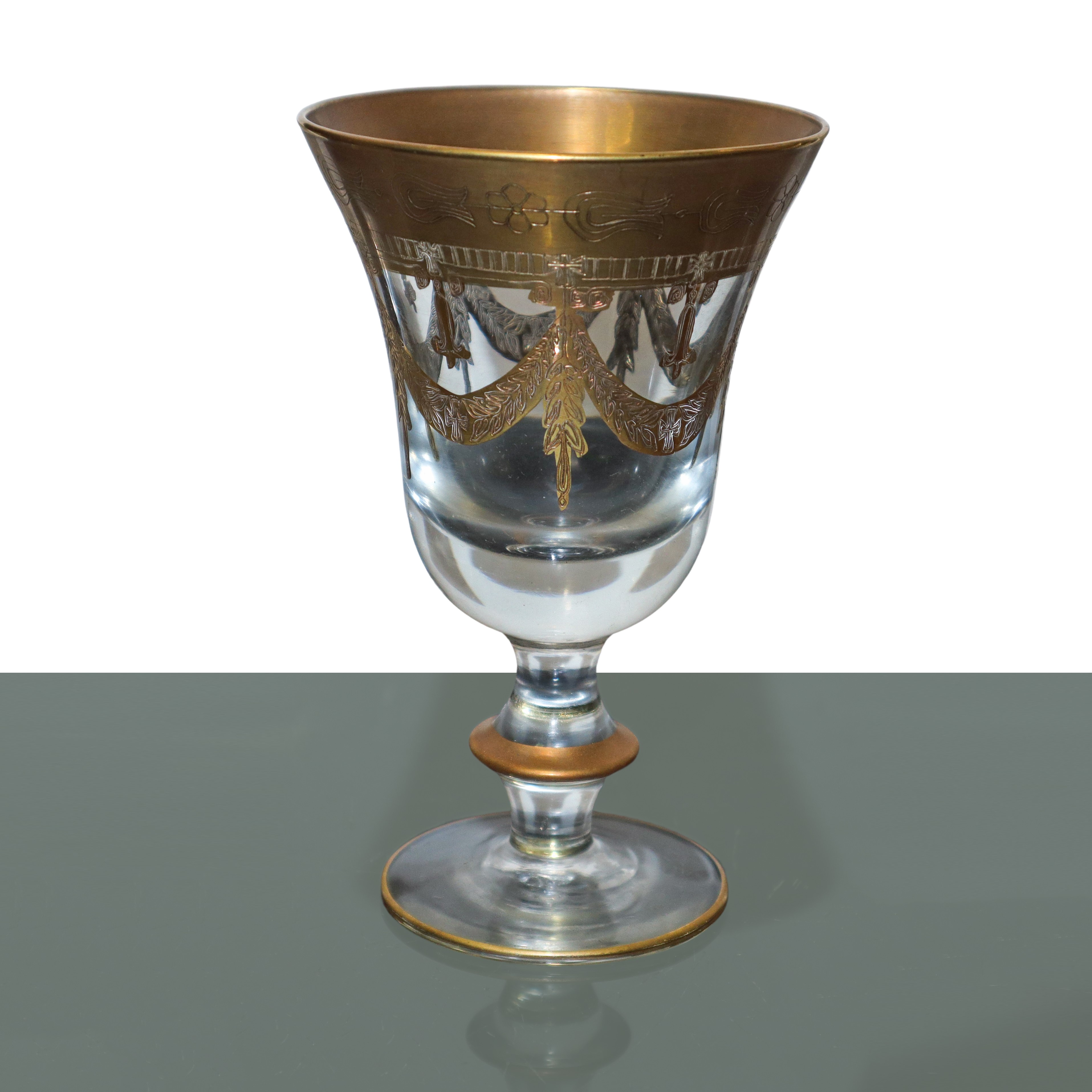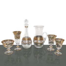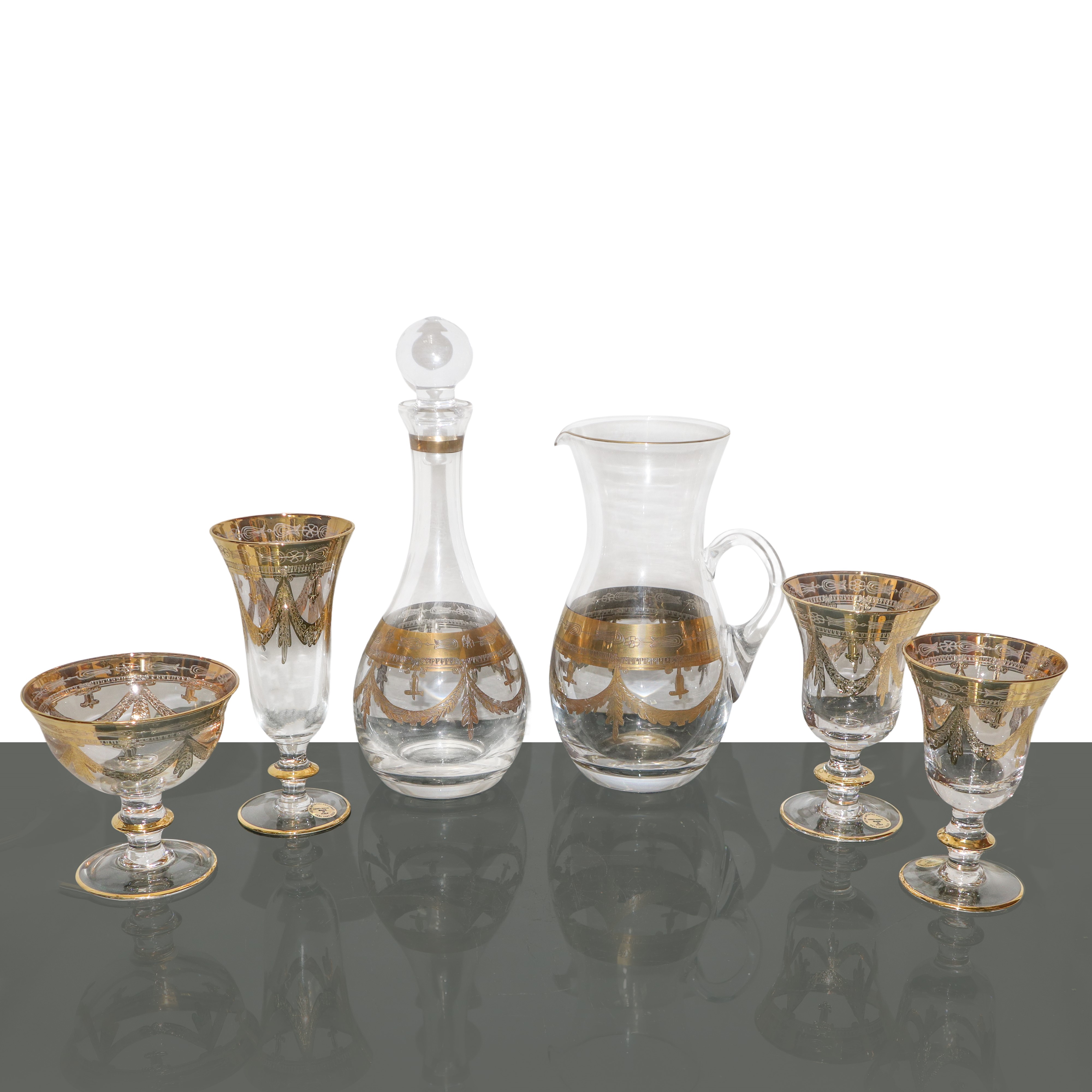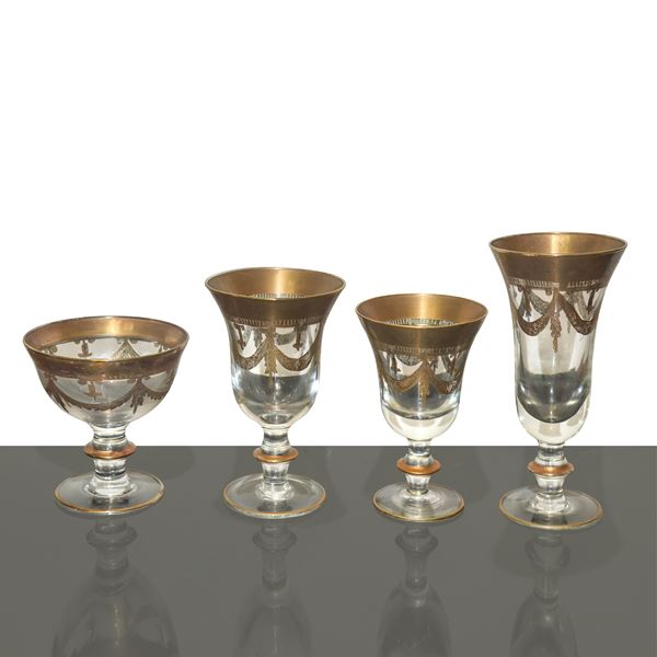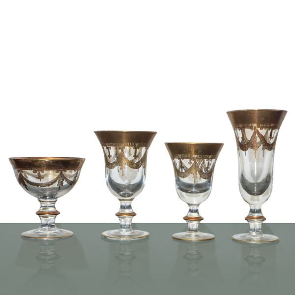 Completissimo Servizio di bicchieri da 30 in vetro di Boemia e foglia d'oro con incisione.