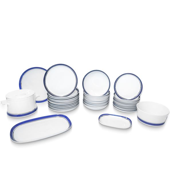 Servizio composto da: 12 piattini frutta, 12 piatti fondi, 12 piatti piani, 1 zuppiera, 1 insalatiera, 3 piatti da portata (2 rettangolari 1 rotondo)