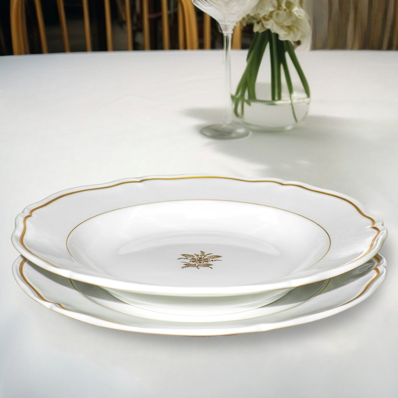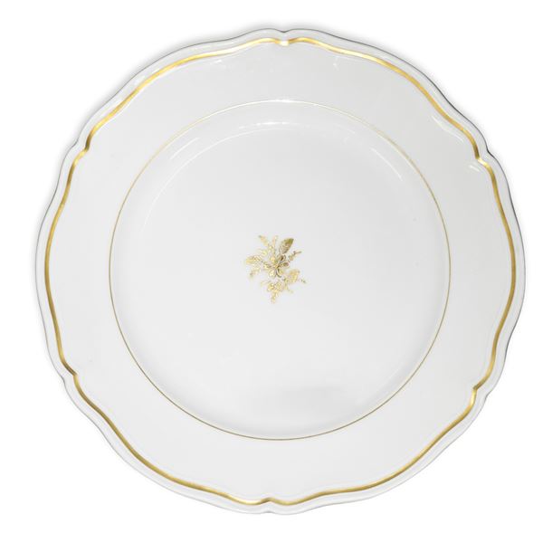 Servizio di piatti da 12 in porcellana bianca con bordo oro e fiore dorato