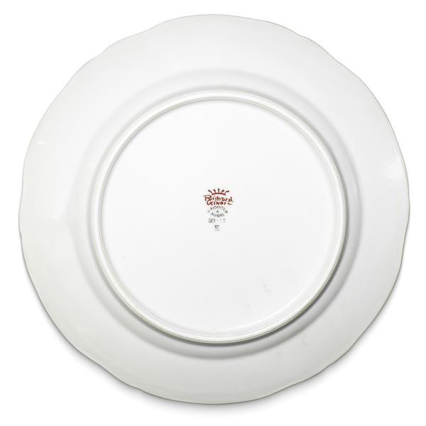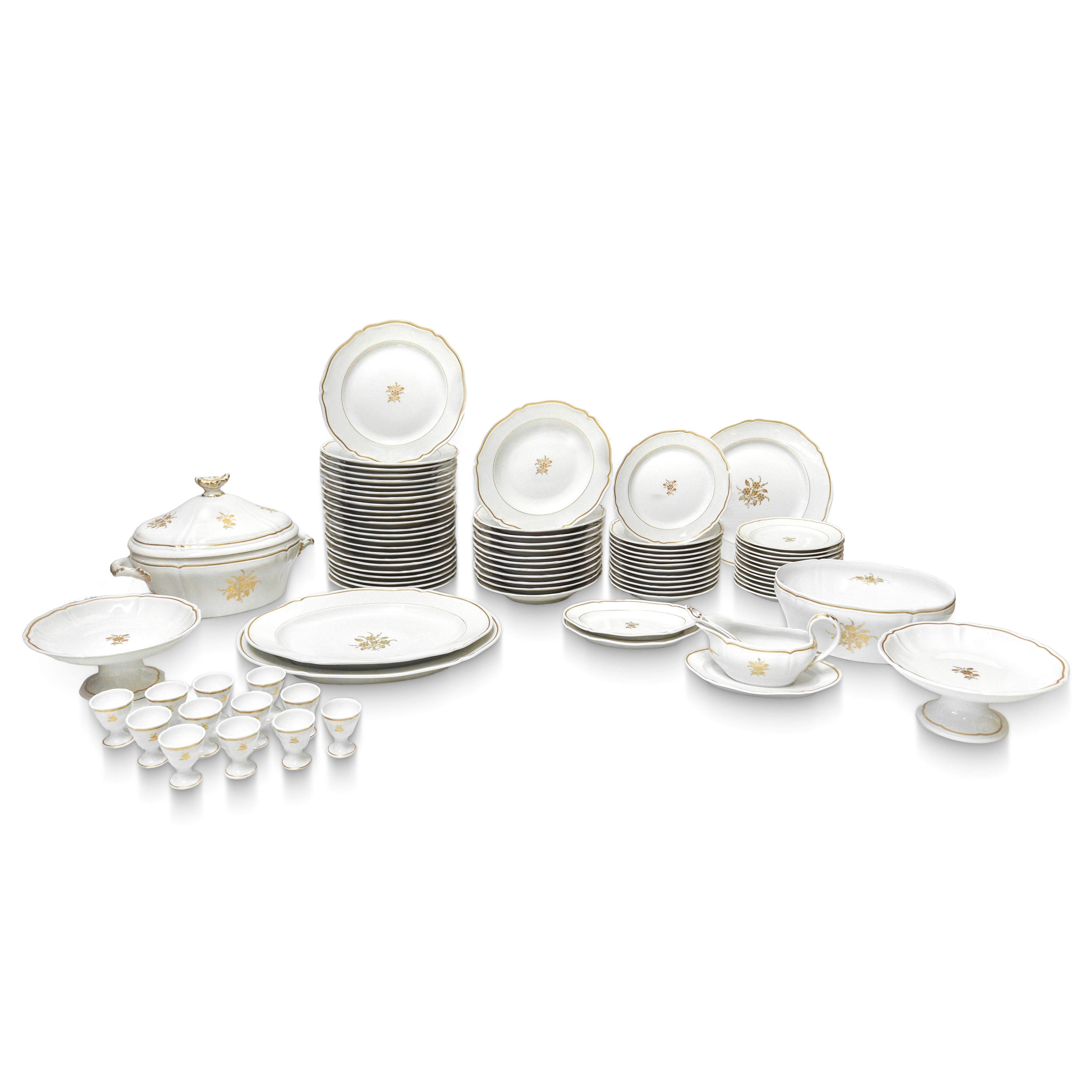 Servizio composto da: 24 piatti piani, 12 piatti fondi, 12 piatti dolce, 12 piatti frutta, 2 piatti da portata ovali, 1 piatto da portata rotondo, 2 alzatine, 2 piatti portaburro, 1 salsiera con mestolo, 1 zuppiera, 1 insalatiera, 12 portauovo