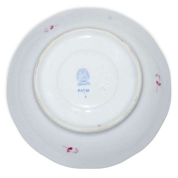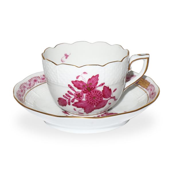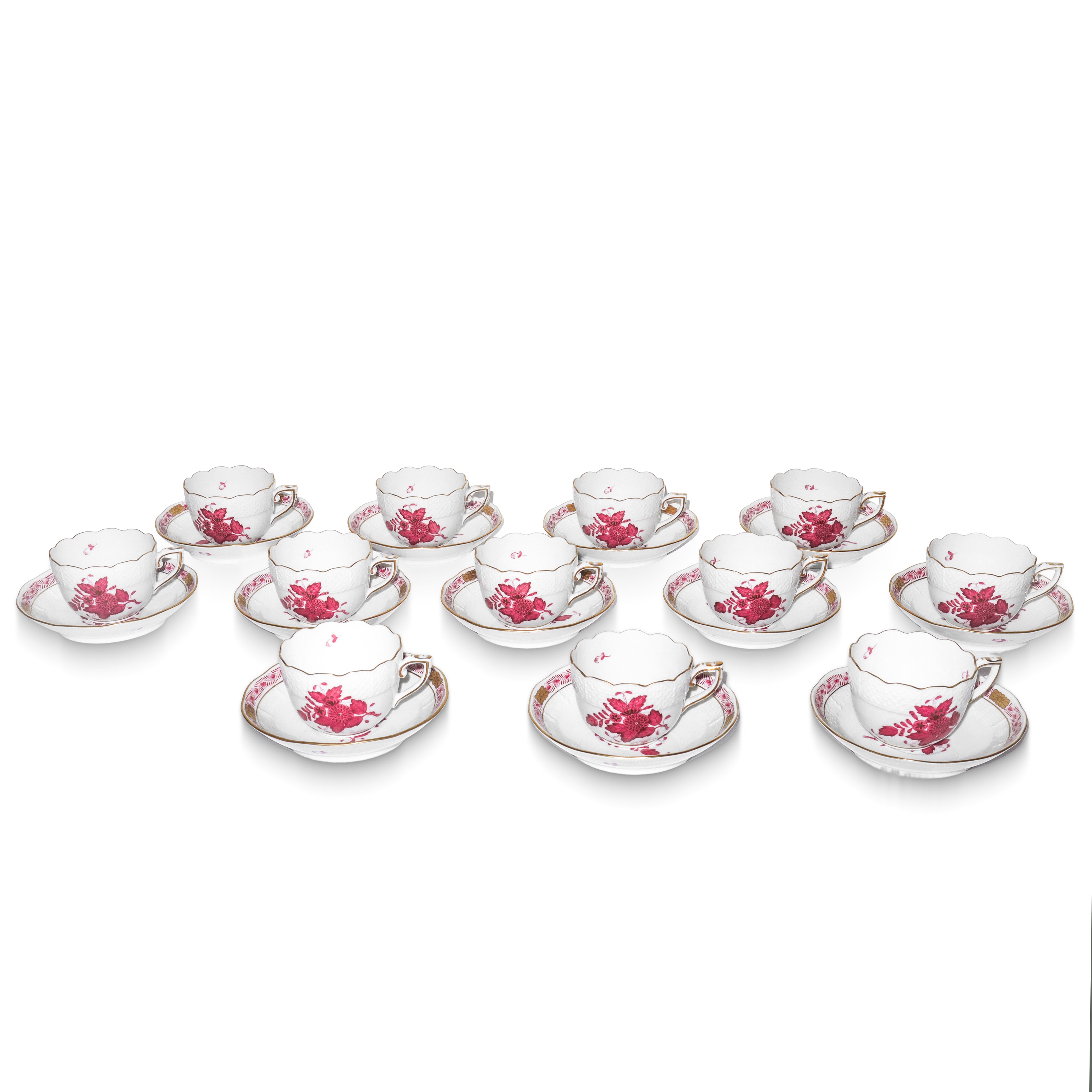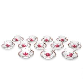 12 tazze da caffè con piattino decoro Apponyi fucsia reale in porcellana bianca Herend,