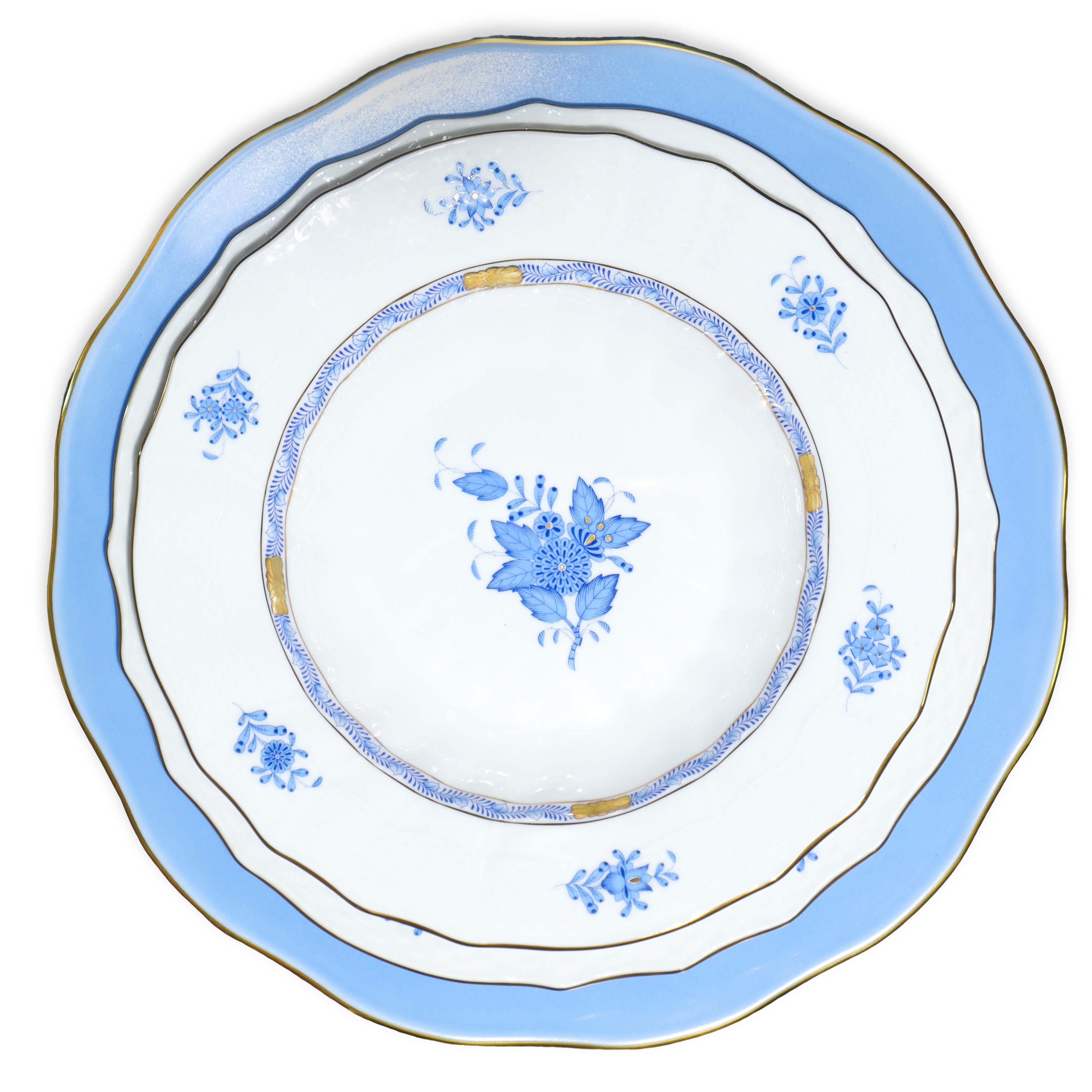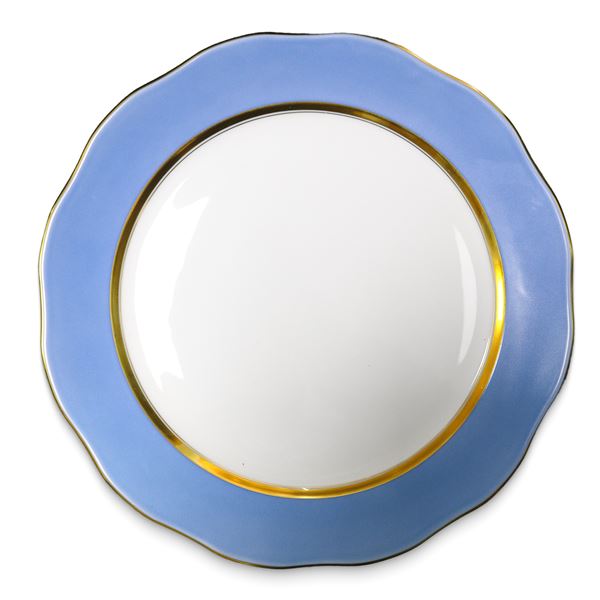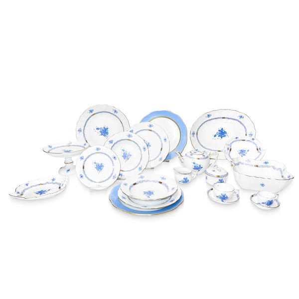Completo Servizio di piatti decoro "Apponyi blue" in porcellana blu su fondo bianco, bordo Ozier e profilo dorato