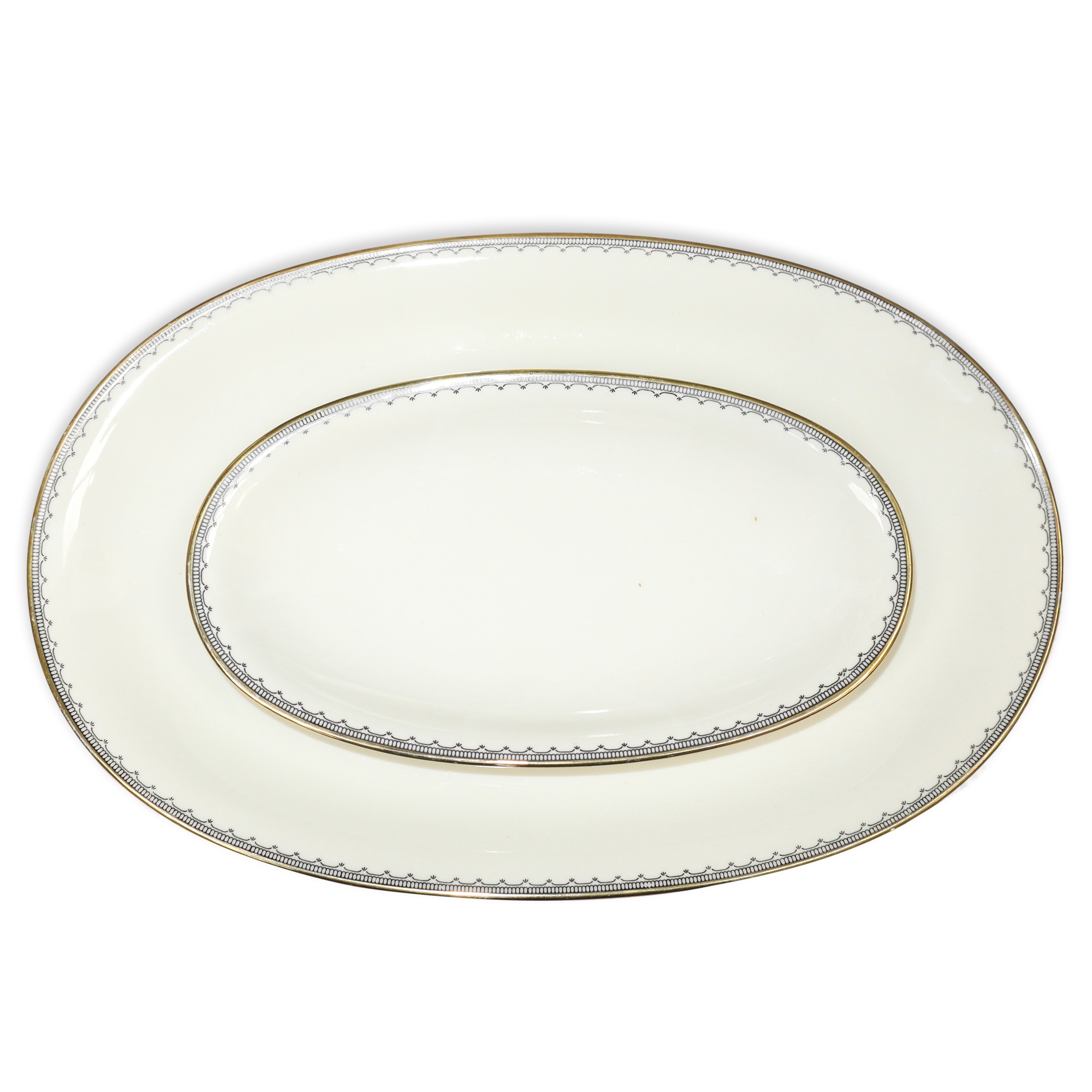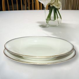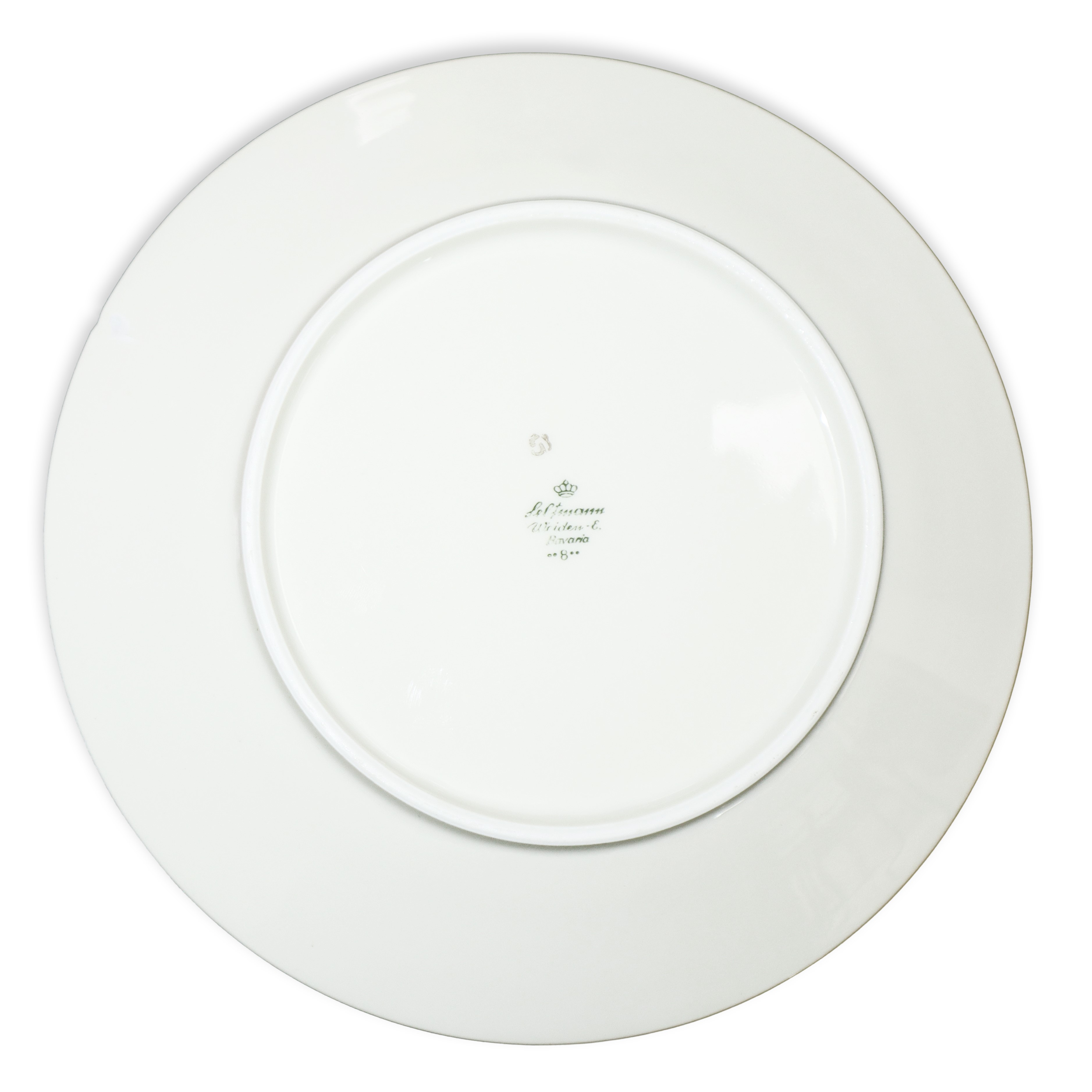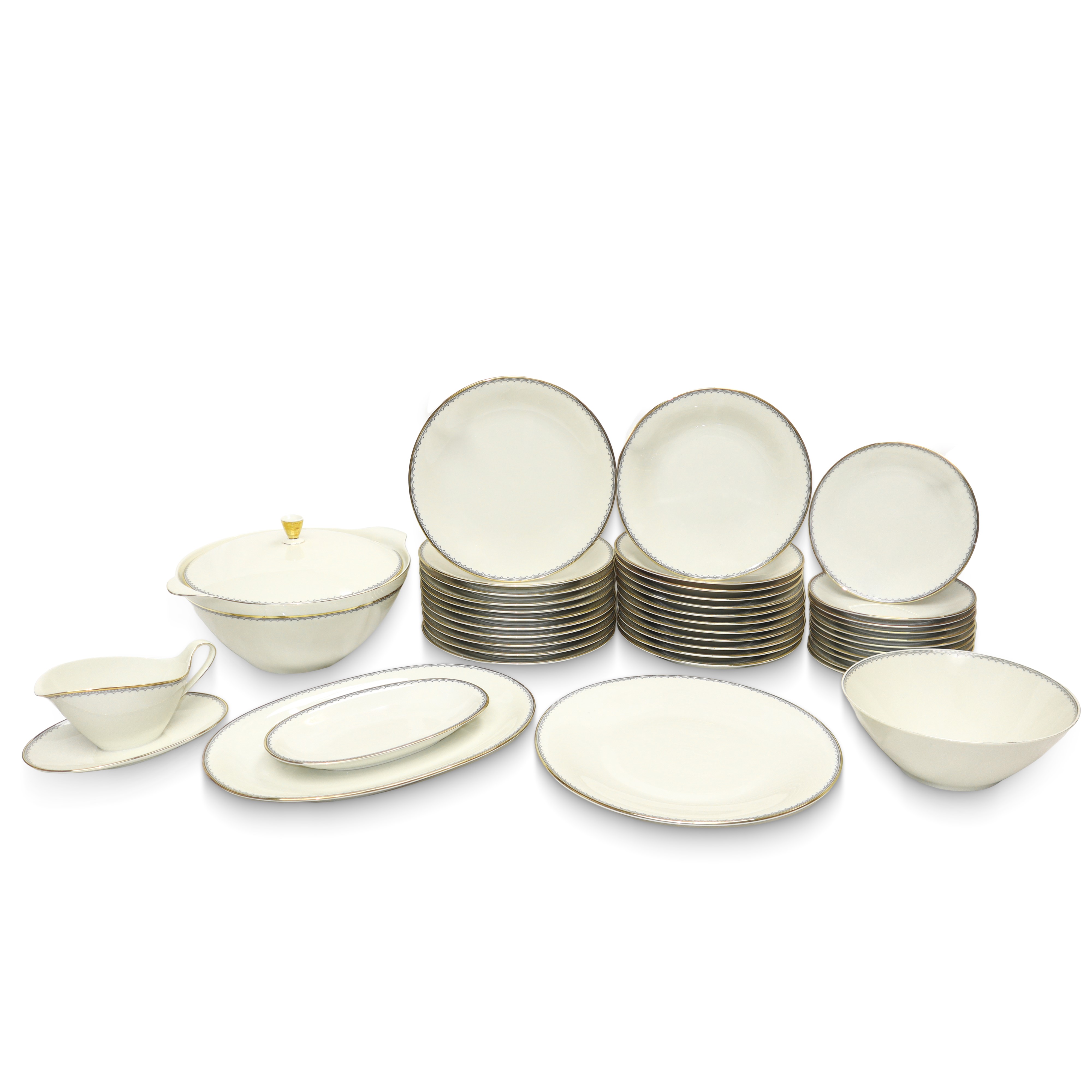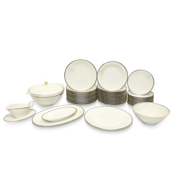 Servizio composto da: 11 piatti piani, 12 piatti fondi, 10 piatti dolce, 1 zuppiera, 1 salsiera, 1 insalatiera, 2 piatti ovali da portata di cui uno grande e uno piccolo, 1 piatto tondo grande