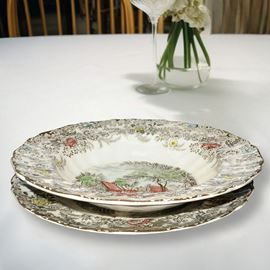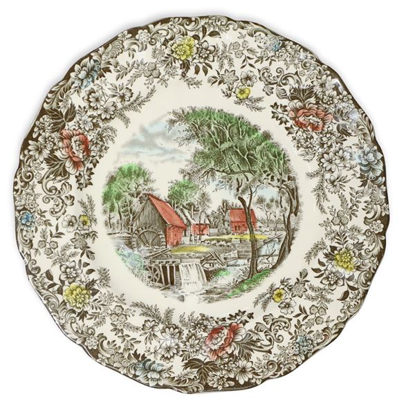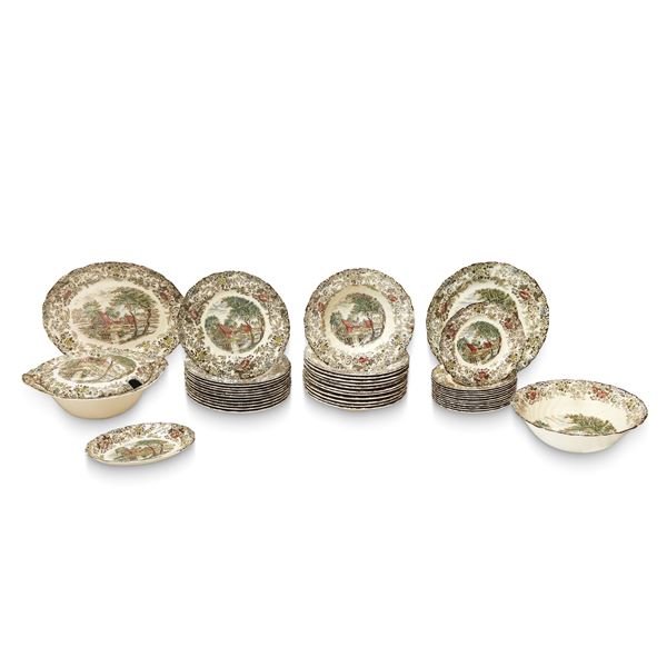 Servizio composto da: 12 piatti piani, 12 piatti fondi, 12 piatti frutta, 1 zuppiera, 1 insalatiera, 1 piatto portaburro, 1 piatto da portata rotondo, 1 piatto da portata ovale