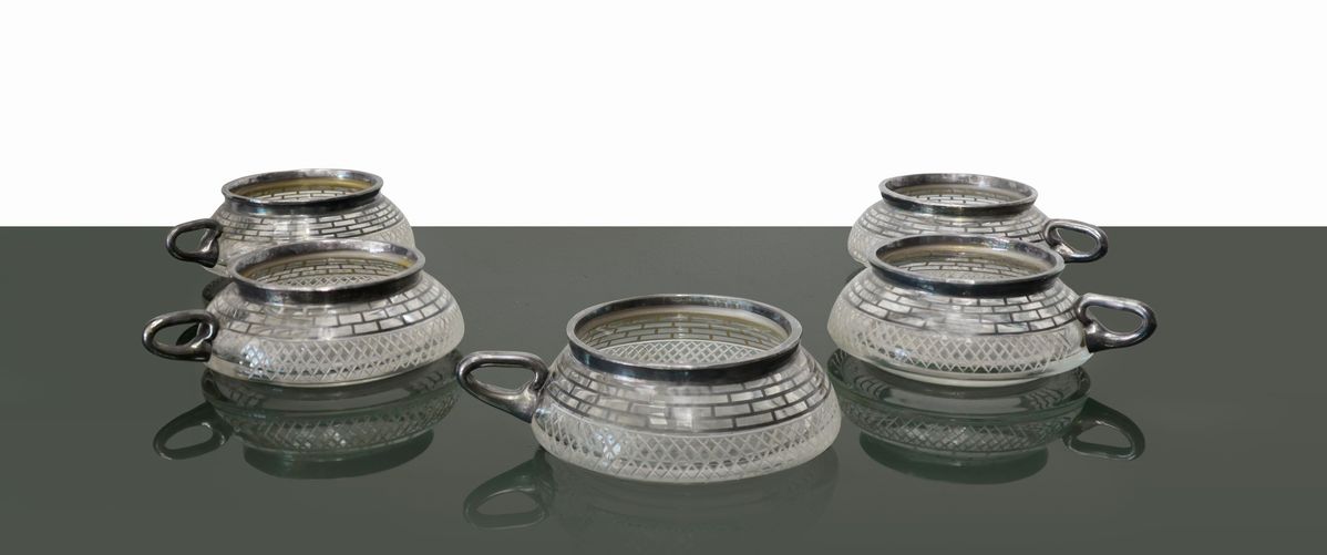 N. 5 salsiere in vetro e decorazioni color argento.