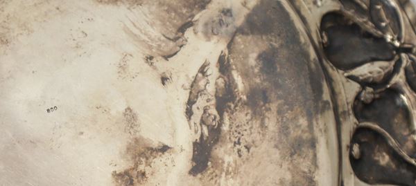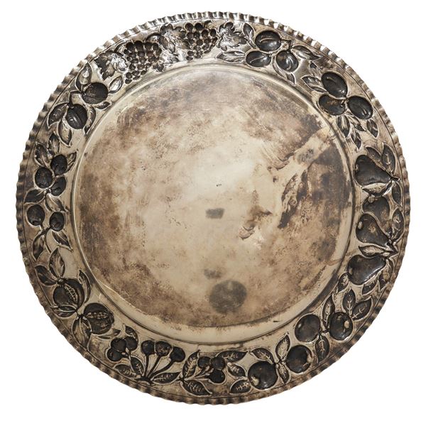 Piatto centrotavola in argento 800 con decorazioni a sbalzo di melagrane lungo il bordo lungo il bordo