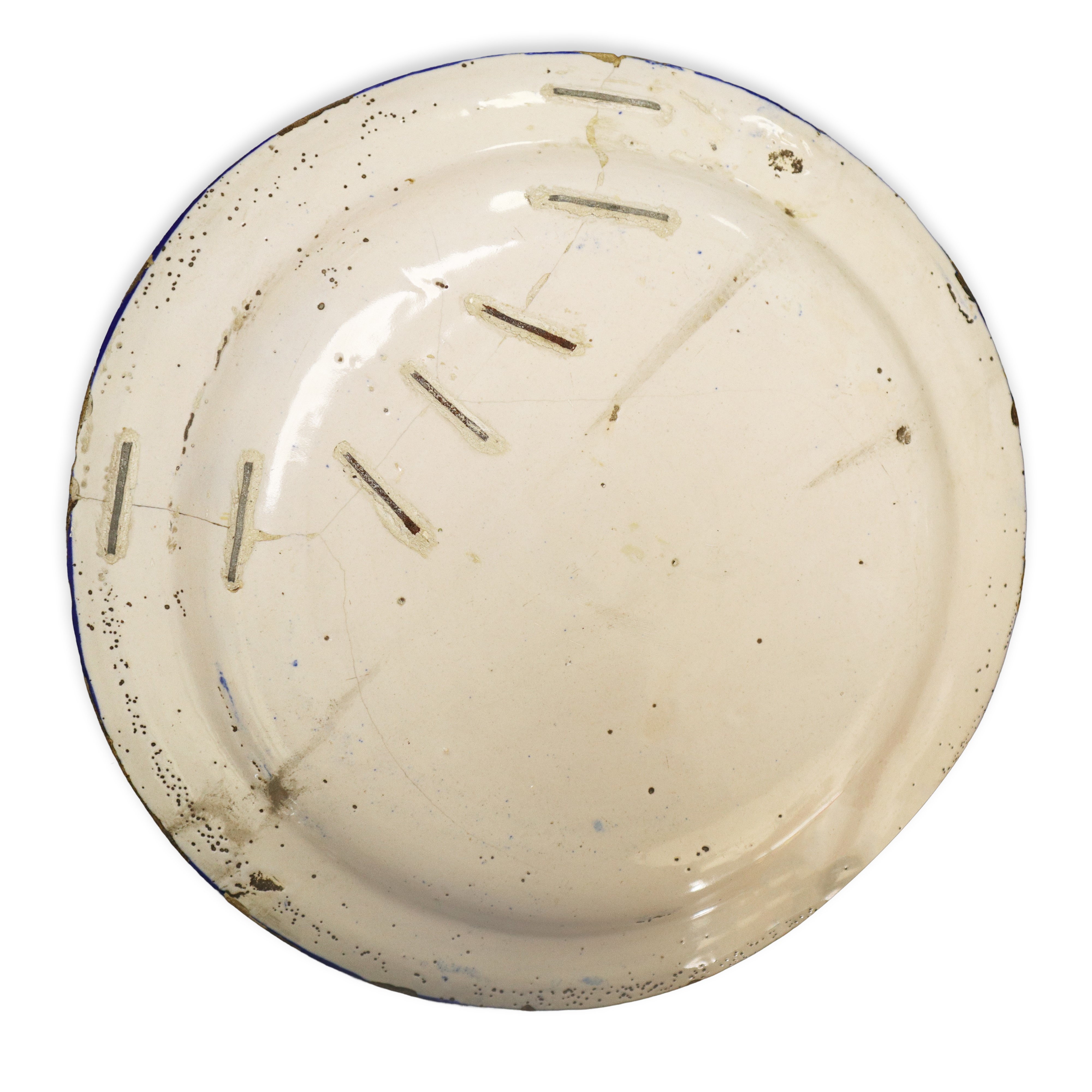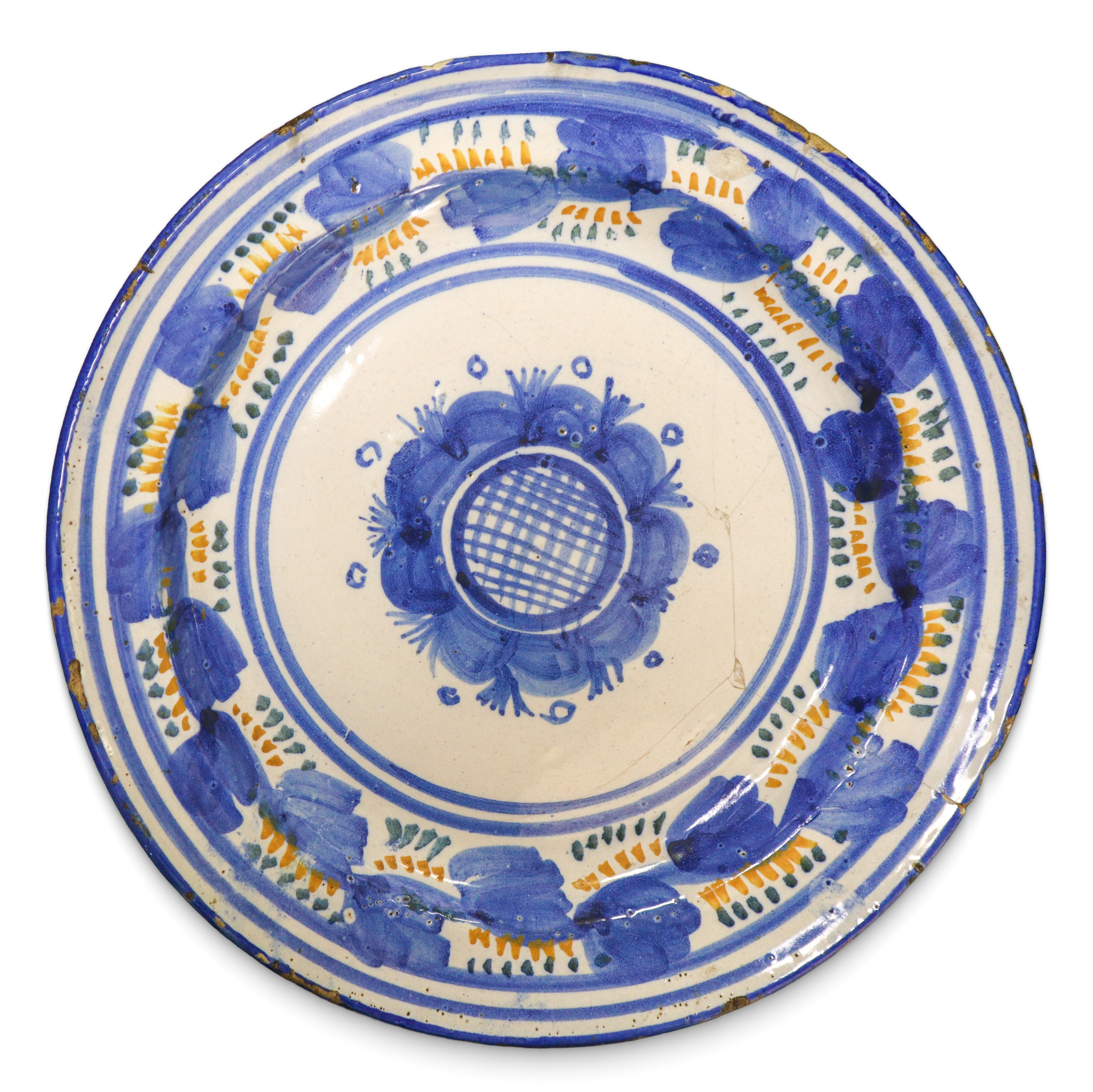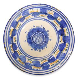 Piatto in ceramica Talavera/Manises con decori nei toni dell'azzurro giallo e verde sul bordo e grande fiore blu al centro, XIX secolo