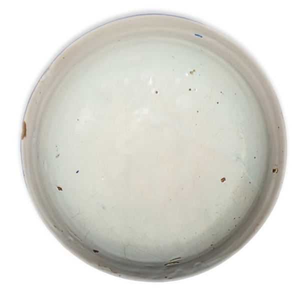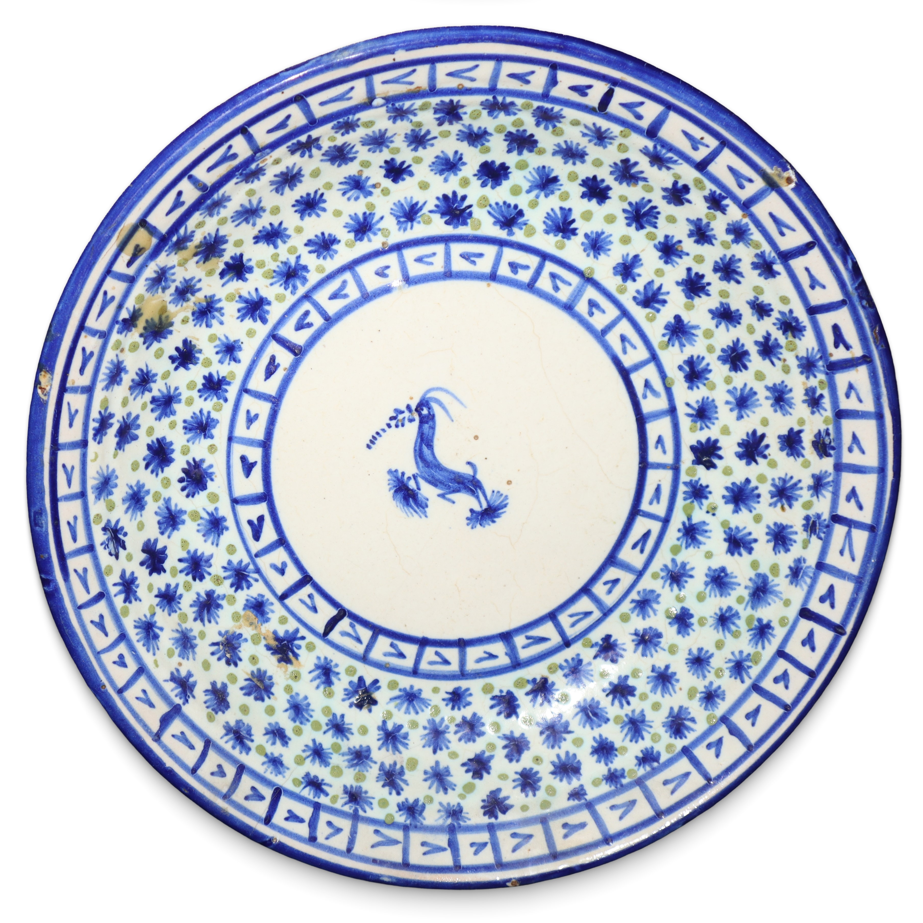Piatto Talavera/Manises decorato nei toni del bianco, blu e verde con uccello al centro, XIX secolo