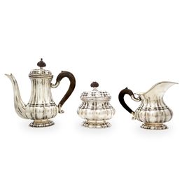 Servizio composto da piccola caffettiera, lattiera e zuccheriera.