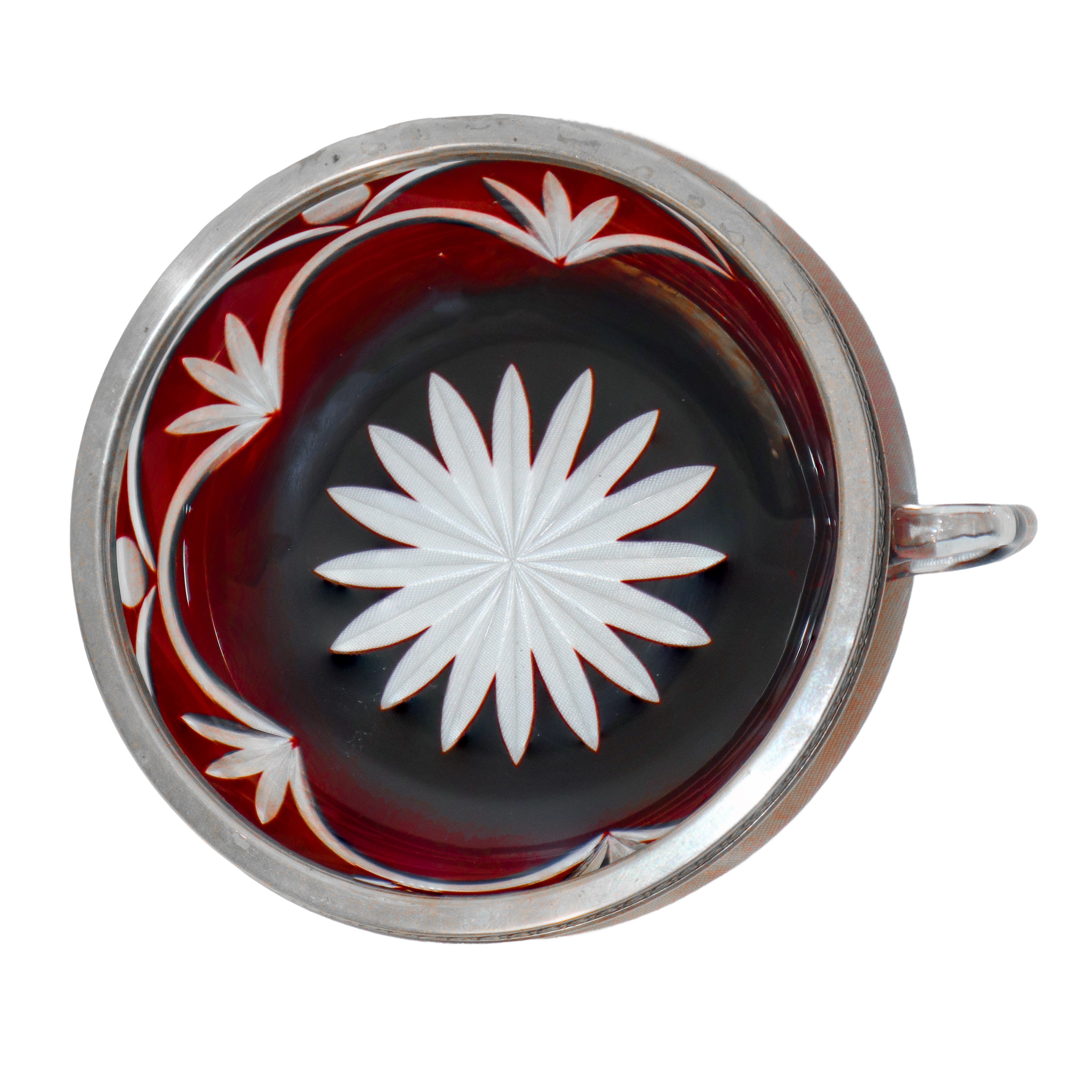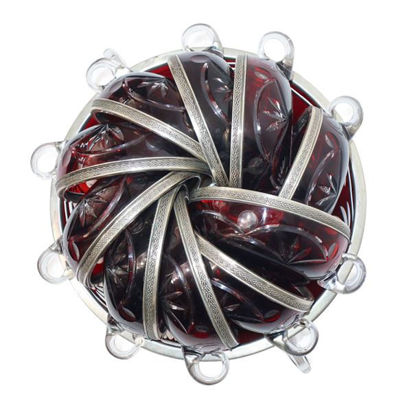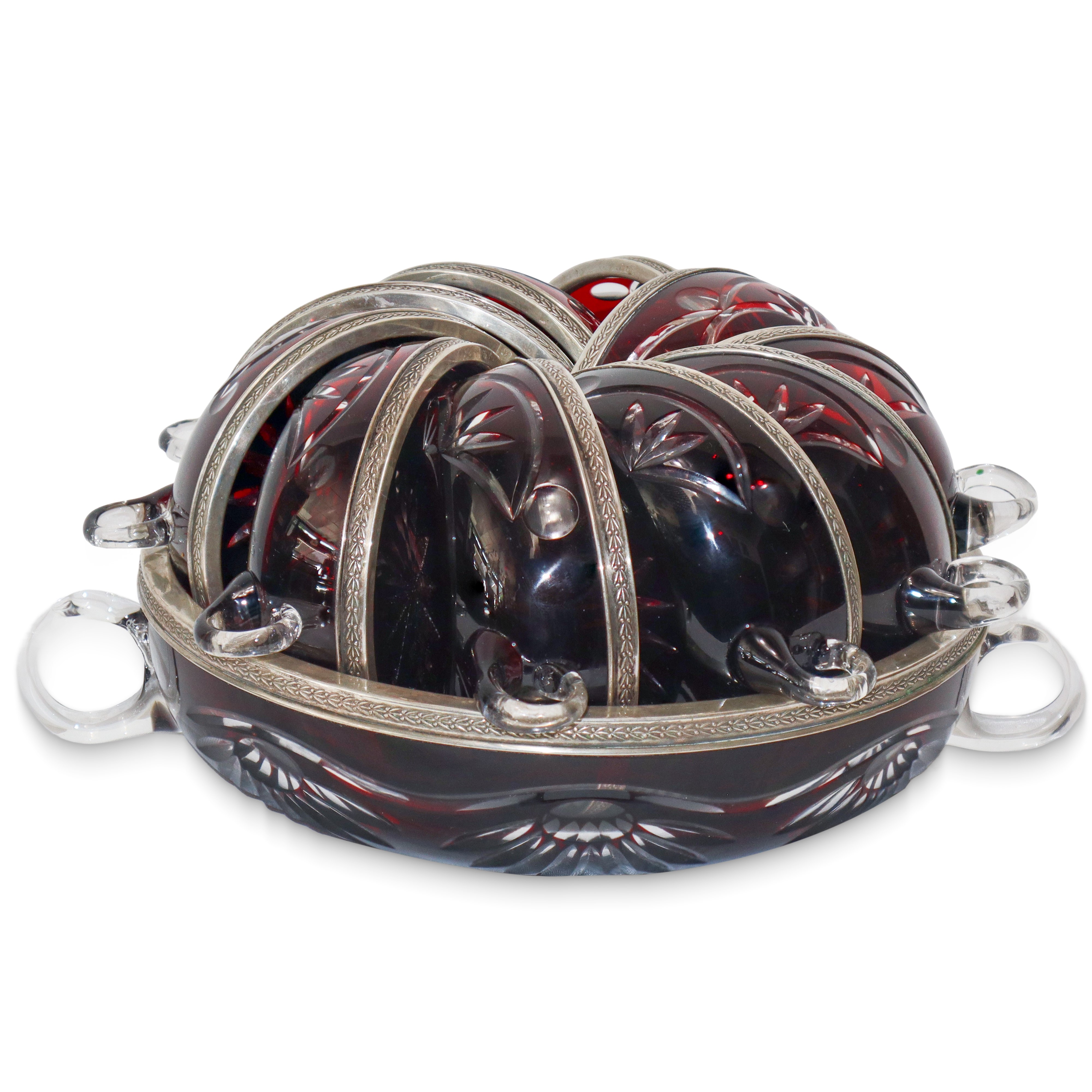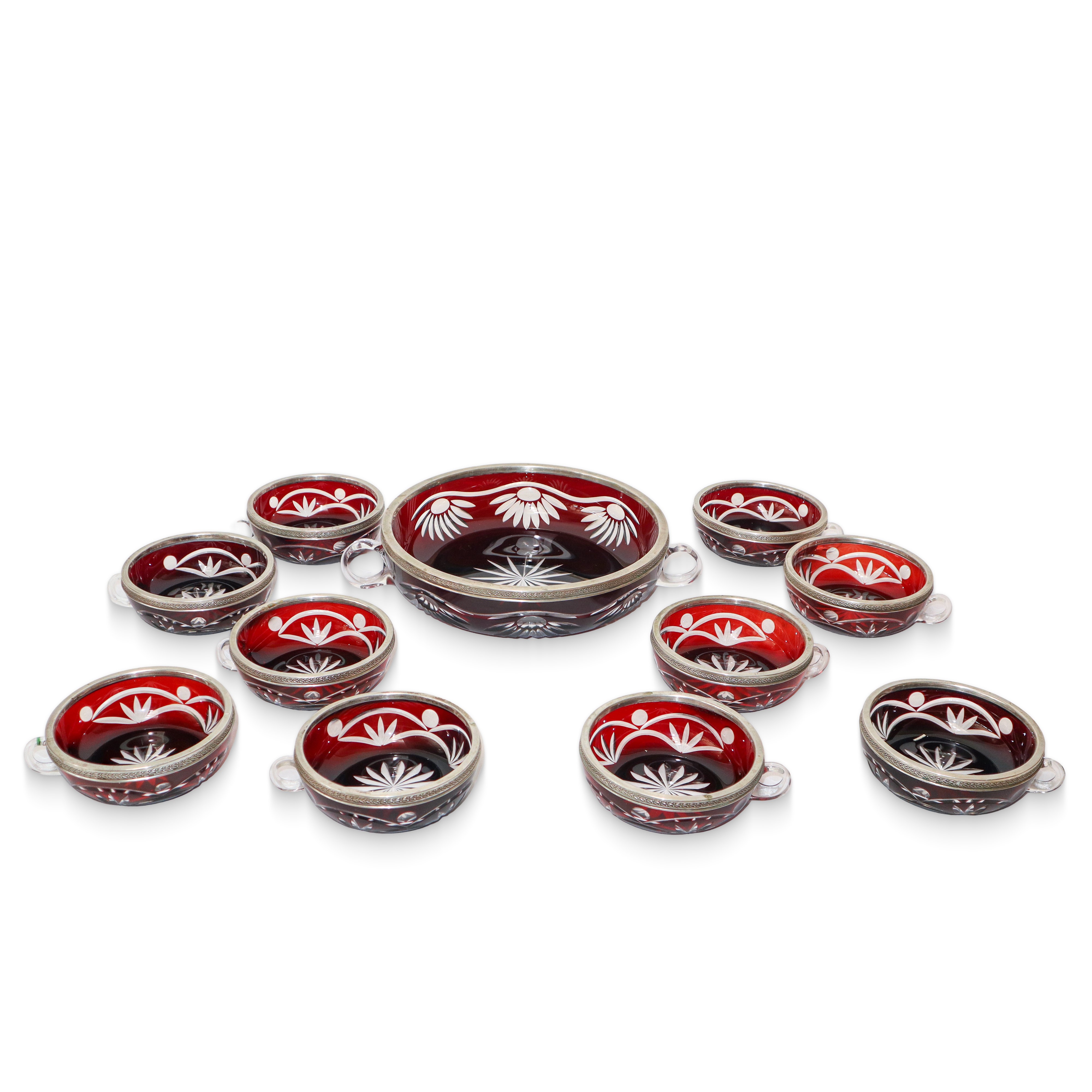 Set da macedonia composto da coppa grande e 10 coppe piccole in vetro di Boemia amaranto intagliato a motivi floreali soffiato a mano con bordo in argento cesellato
