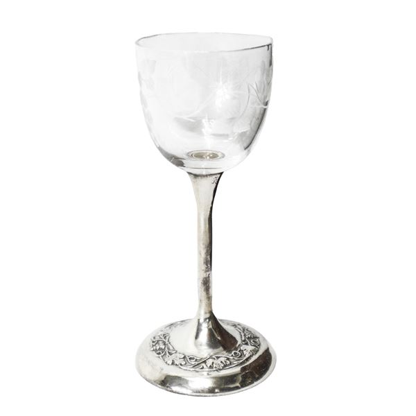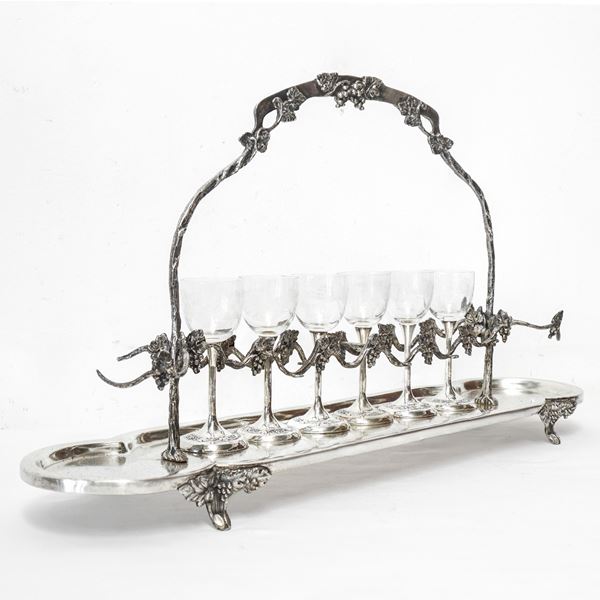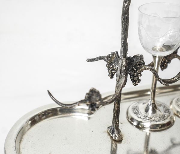 Set da rosolio con bicchierini in vetro molato e intagliato a tralci di vite e stelo in sheffield con vassoio sbalzato con motivi di tralci di vite