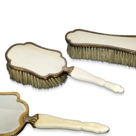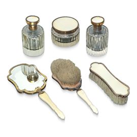 Set da toletta in cristallo e osso composto da 6 pezzi: 2 spazzole, specchio, portacipria, 2 bottiglie portaprofumo
