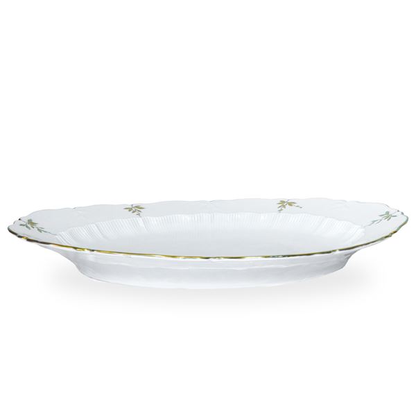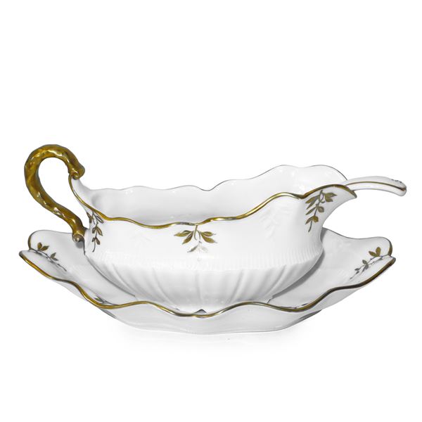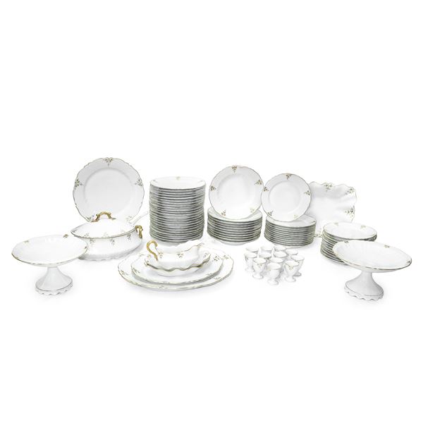 Servizio composto da:24 piatti piani, 11 piatti fondi, 12 piatti dolce, 12 piatti frutta, 12 portauova, 2 alzatine, 1 zuppiera con mestolo, 3 piatti da portata, 1 insalatiera quadrata, 1 salsiera, 2 piattini da burro
